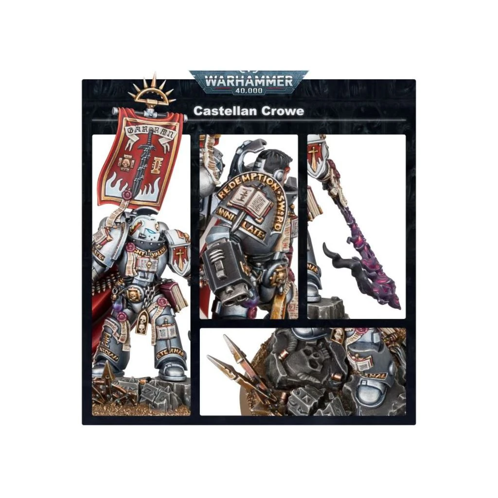 Le Castellan Crowe est un guerrier incorruptible et un puissant choix QG pour une force de Grey Knights. Duelliste hors pair, Crowe peut isoler et abattre les personnages ennemis avec l’Épée Noire maudite d’Antwyr, sa volonté indomptable lui permettant d’encaisser des blessures qui auraient raison d’un autre Space Marine. Psyker habile, Crowe peut également déchaîner des vagues de flammes psychiques sur ses ennemis.