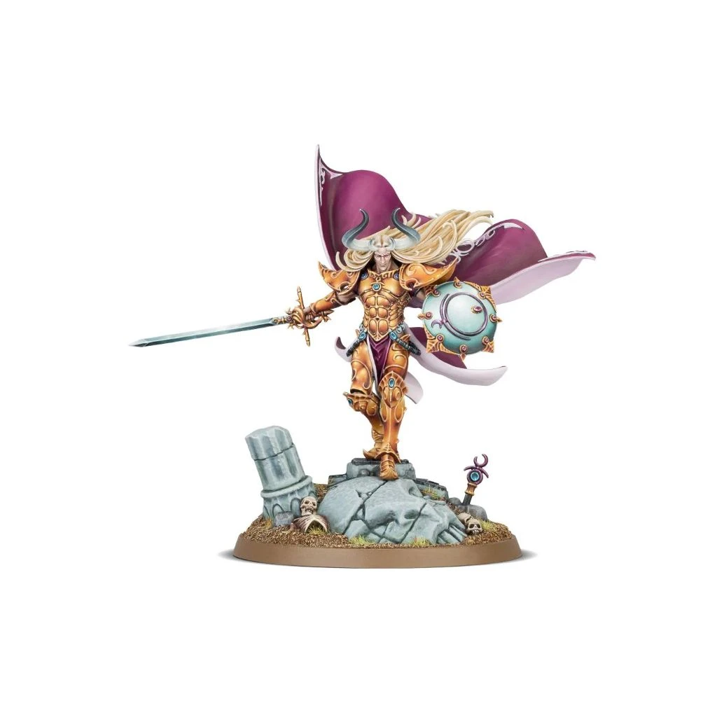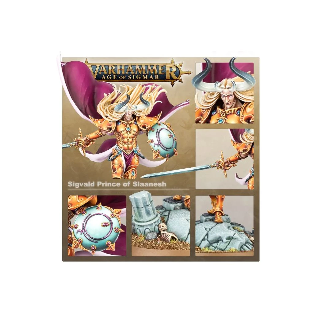 Sigvald le Magnifique se considère comme le fils favori de Slaanesh. Rares sont ceux qui osent remettre cet avis en question. Au combat, le Prince Verni est tel un mirage doré au rire cruel, dont l’élégante lame pourfend la piétaille aussi bien que les champions.