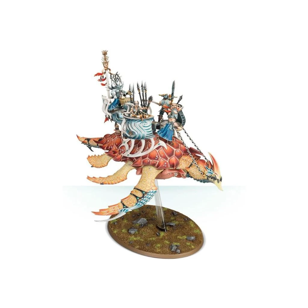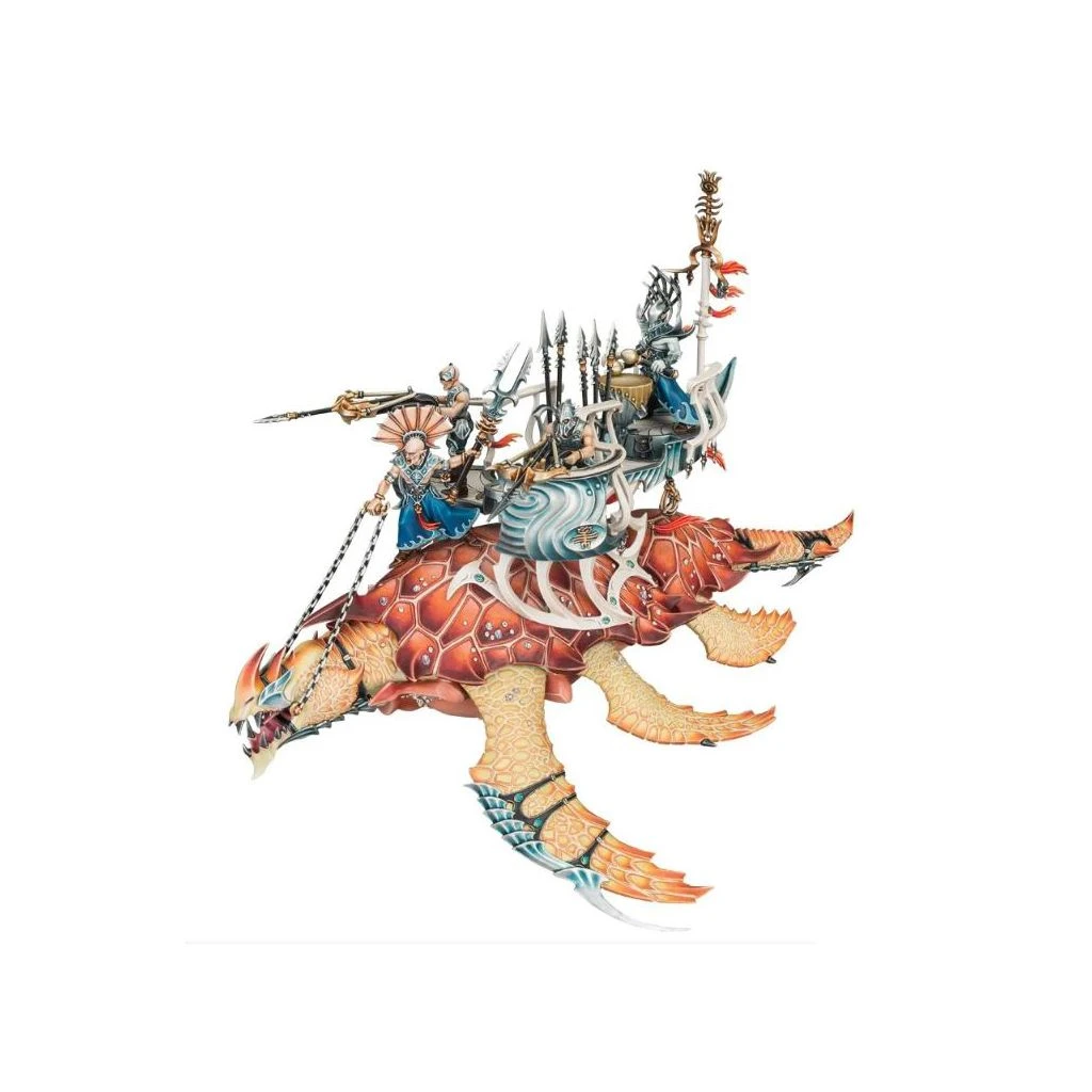 Faisant fi des projectiles adverses, l’Akhelian Leviadon plonge dans la mêlée. Ses nageoires en forme de faux démembrent l’ennemi tandis que les mâchoires de la bête claquent avec assez de force pour broyer l’acier trempé. Pour se défendre, les passagers aelfs frappent avec des crochets et des lames, et le ma’harr, un Akhelian de haut rang qui dirige la bête, empale l’ennemi sur sa lance à double pointe. Protégé par ses écailles épaisses et une carapace impénétrable, le Leviadon est un point d’ancrage indomptable pour la phalange Idoneth. Qu’elles servent de bélier vivant pour briser la ligne de bataille ennemie ou comme plate-forme d’armes mobile chargée d’éliminer des cibles spécifiques, ces énormes bêtes asservies ont fait leurs preuves à de nombreuses reprises.