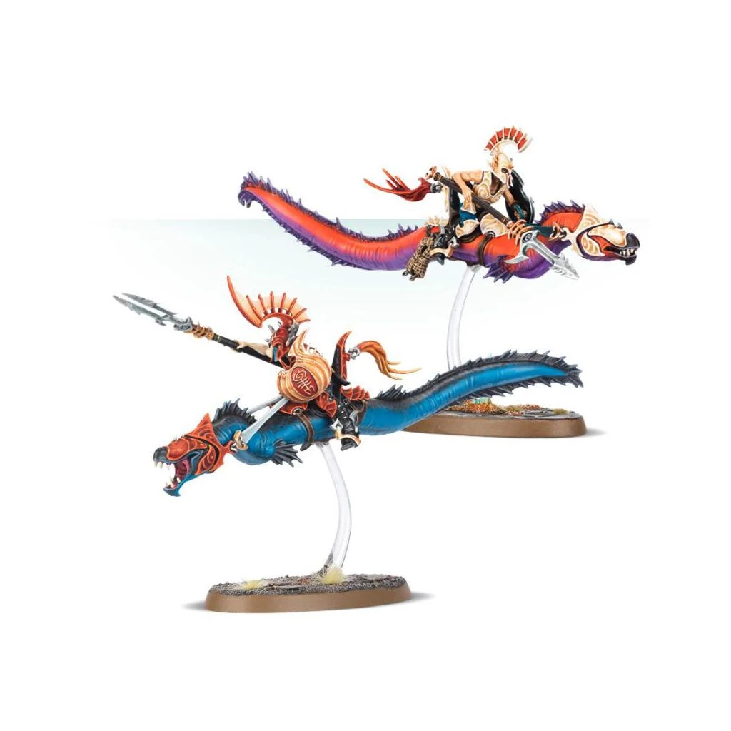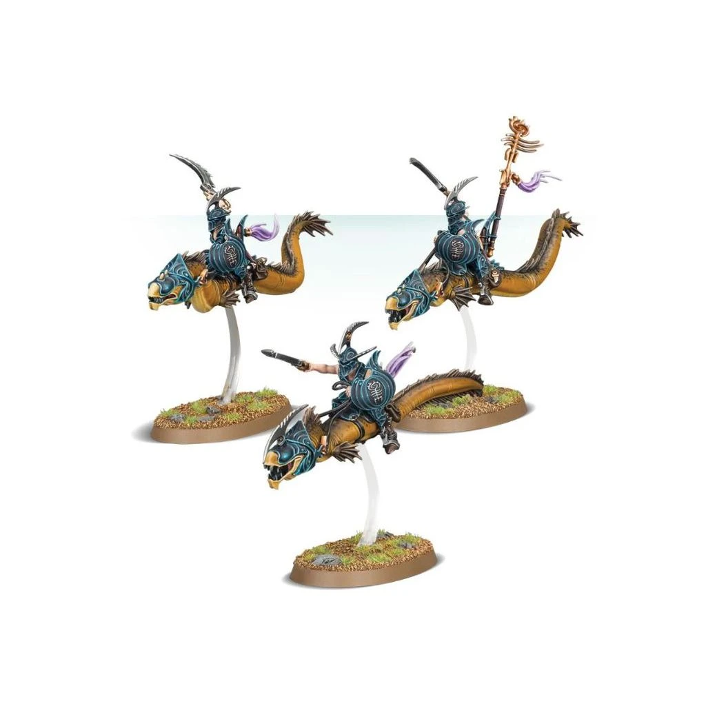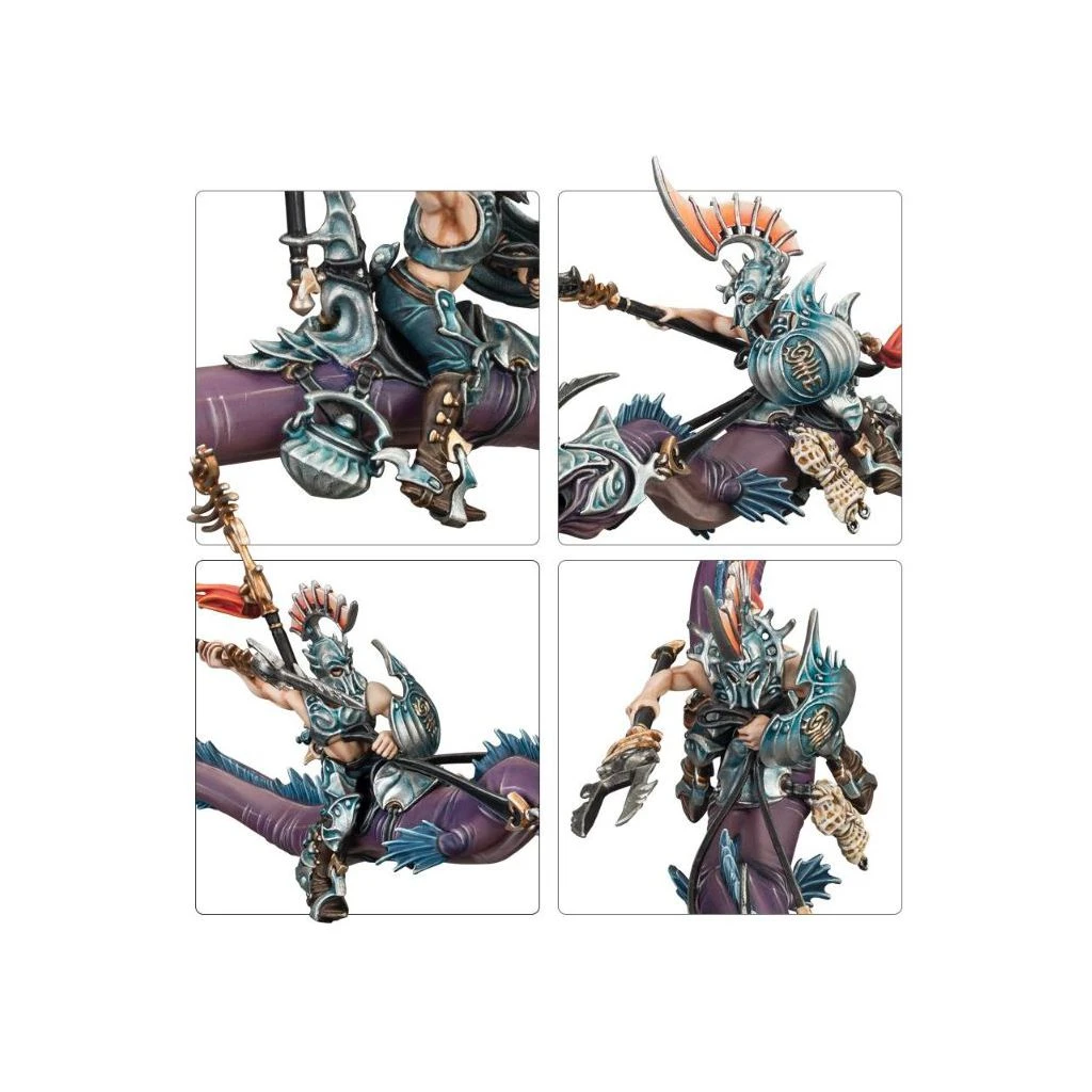 Ce kit plastique contient les composants nécessaires pour assembler 3 Morsarr Guards. Chacun a pour monture une Fangmora Eel, une bête asservie agile et sinueuse contrôlée grâce aux solides rênes et œillères assujetties à sa tête, et qui attaque avec sa gueule garnie de crocs et sa queue fouetteuse. Les cavaliers Akhelians portent de solides cuirasses, même s’ils ont les bras nus et les jambes protégées par de la cotte de maille et de la toile dans un souci de mobilité. Ils sont munis de lances choc et de boucliers galvaniques, et arborent des heaumes au splendide cimier – un modèle particulier en forme de voile est inclus pour désigner le Lochian Prince qui dirige l’unité. Les options permettent de monter un musicien avec conque et casque découvrant son visage, plus un porte-étendard dont l’anguille Fangmora est munie d’un grand pennon. Le kit propose de nombreux accessoires pour agrémenter les montures et les socles – filets, cordages, bouteilles et autres lampes.
