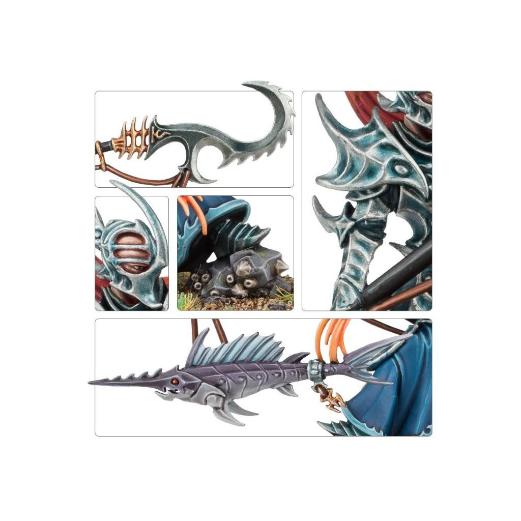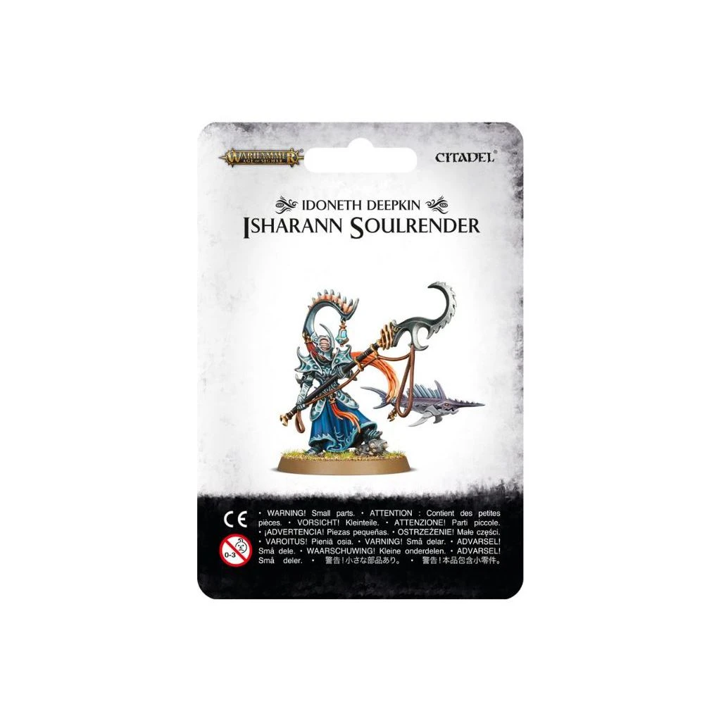Ce kit plastique contient les composants nécessaires pour assembler un Isharann Soulrender. Nanti d’une armure bien plus lourde que celle de ses subordonnés Namarti, ce personnage arbore d’énormes épaulières en forme de rets qui lui donnent une silhouette des plus agressives. Le bas de la figurine est caché sous une robe brodée de vagues, et on aperçoit ses épaisses bottes qui dépassent – le pied gauche s’appuie sur un roc couvert d’anatifes sculpté dans le socle. Le heaume se distingue par son absence de vantail et son imposant cimier, qui s’achève par le leurre lumineux servant à attirer les âmes qui ressusciteront ses compagnons. Son talúnhook est plus grand que lui et son fer dentelé cruel comporte un crochet acéré et une longueur de ligne pour capturer ses proies. Le Rakerdart qui l’accompagne est visiblement coutumier du combat, avec son corps couvert de plaques et son dard à l’aspect offensif.