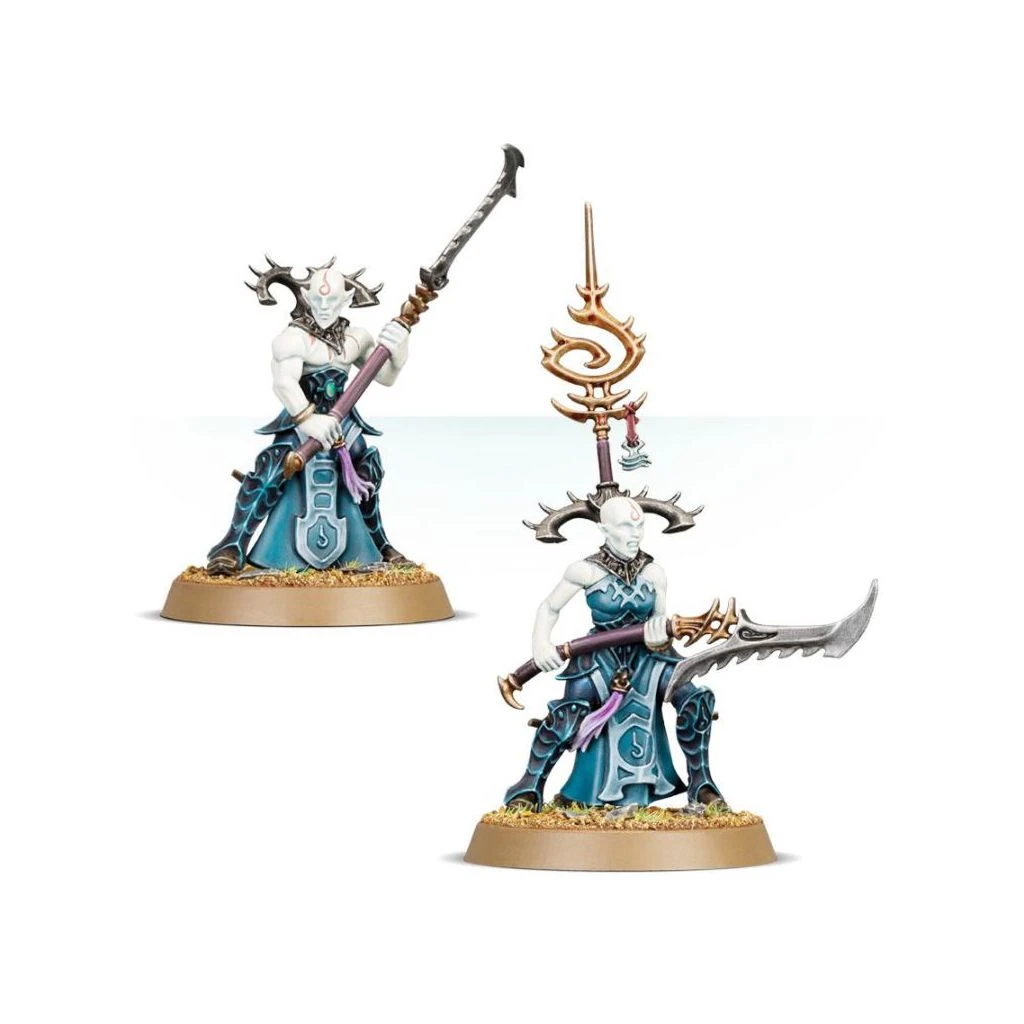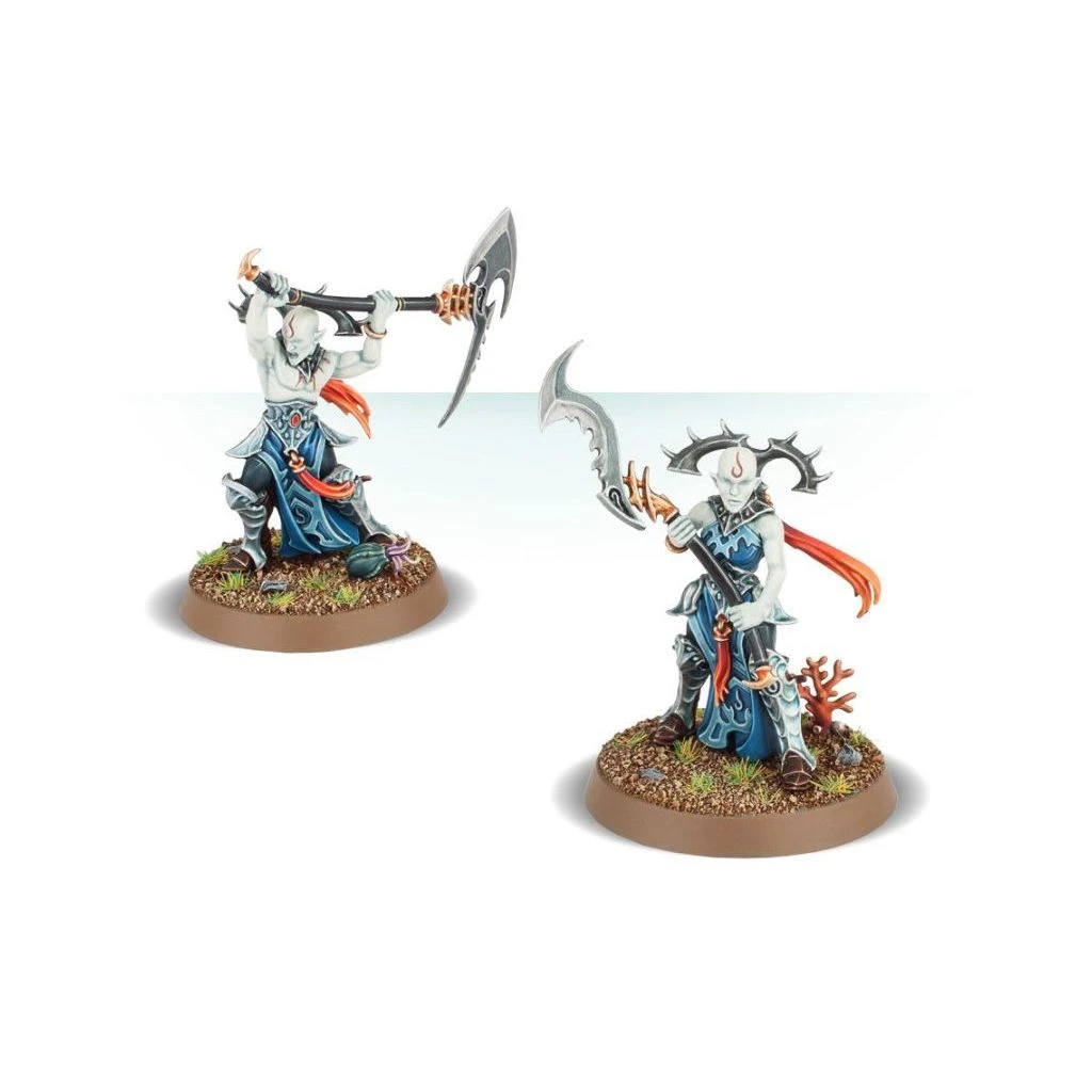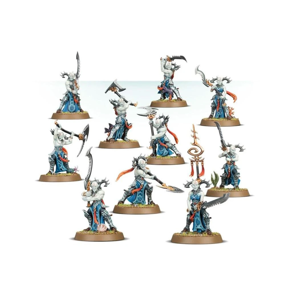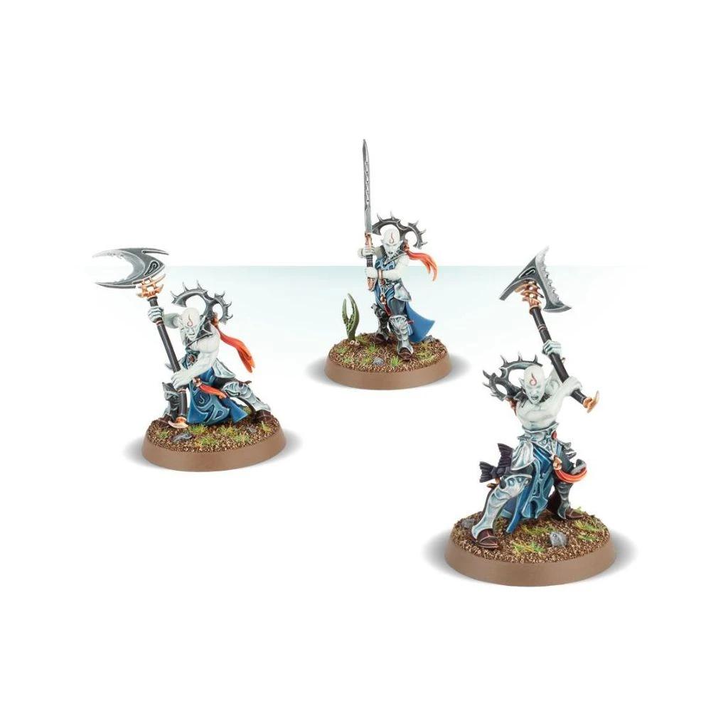 Comme tous les Aelfs, les Namarti Thralls possèdent une grâce physique surnaturelle aux yeux des autres races. Au combat, les Thralls sont l’épine dorsale de l’infanterie Idoneth, et leur tâche est de protéger leurs camarades, puis d’engager et bloquer l’ennemi. Les Namarti Thralls combattent à l’aide d’un arsenal collectivement appelé lanmari – des épées à deux mains, de grandes haches-faux ou des armes d’hast à la forme étrange. Le poids et la portée de ces armes sont utiles pour repousser les énormes créatures marines qui rôdent dans les enclaves Idoneth, et leurs larges lames sont parfaites pour éliminer les bancs de poissons prédateurs qui cherchent à dévorer les Aelfs.