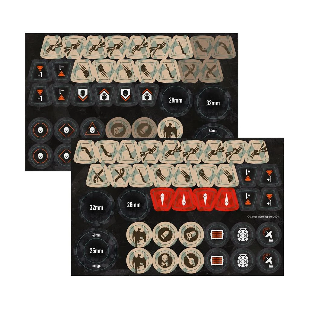 Dans la boîte, vous trouverez également une planche de 39 pions double face de la Parenté d’Exorôdeurs, afin de garder facilement un œil sur votre équipement et les effets en cours dans le feu de la bataille.