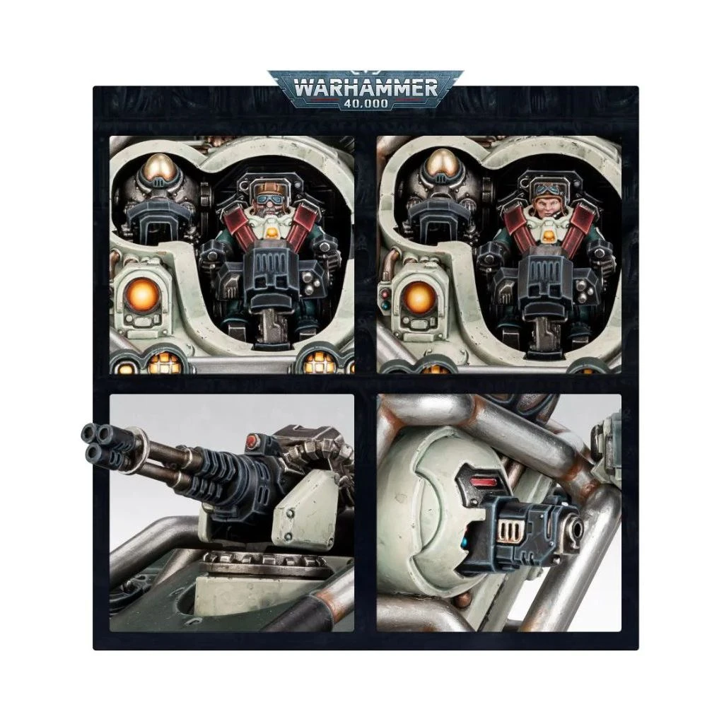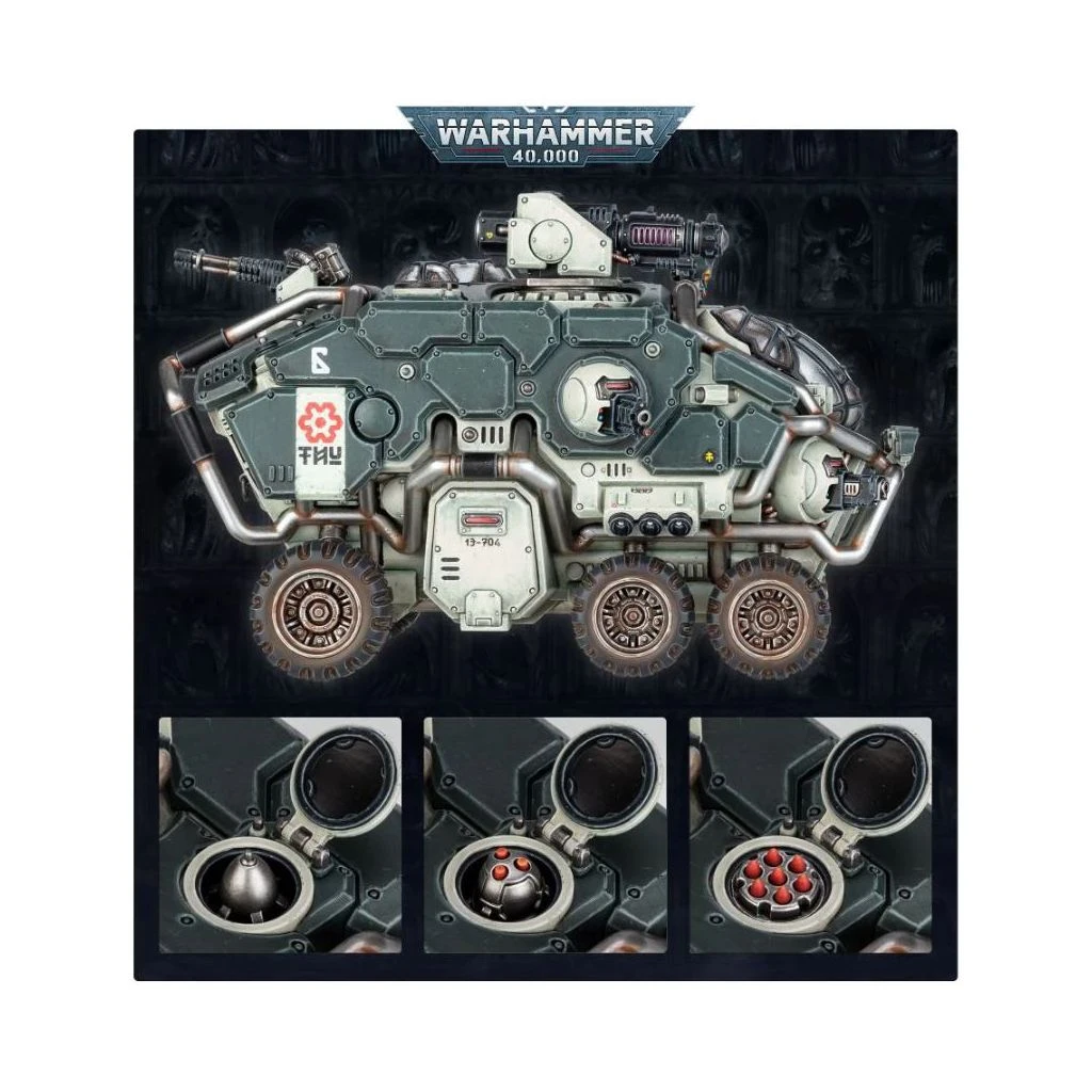 L’Hekaton dispose également d’un autocanon MATi-R tourné vers l’arrière et un scanner panspectral pouvant être remplacé par un silo de missiles, contenant une ogive d’ire des Cognats, brise-montagne ou de vengeance ancestrale. Le char dispose de plaques de blindage renforcées, de trappes de transport sur tous les flancs pour déposer sa cargaison pugnace, et d’un pilote visible sous un écran de plastique transparent. Le kit contient trois têtes différentes pour personnaliser votre pilote, ainsi que des phares optionnels pour les arceaux avant.