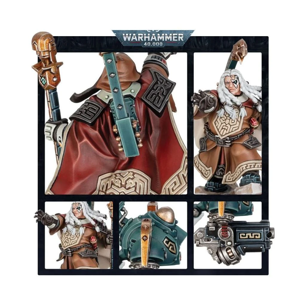 Ce kit plastique permet d’assembler un Grimnyr, un psyker puissant et rusé accompagné de deux CORV. Drapé de robes cérémonielles et protégé par son cimier à tête d’oiseau, ce personnage chamanique manie un sceptre de protection ancestral surmonté d’un visage votannique. Ce kit propose deux têtes : une avec une barbe et une capuche mystérieuse, et l’autre avec des tresses lâchées. Les CORV gravés de runes qui accompagnent le Grimnyr au combat lui offrent le soutien de leurs bolters modèle Autoch, mais ils servent également de canalisateurs qui le protègent des dangereux déferlements de puissance empyréenne.