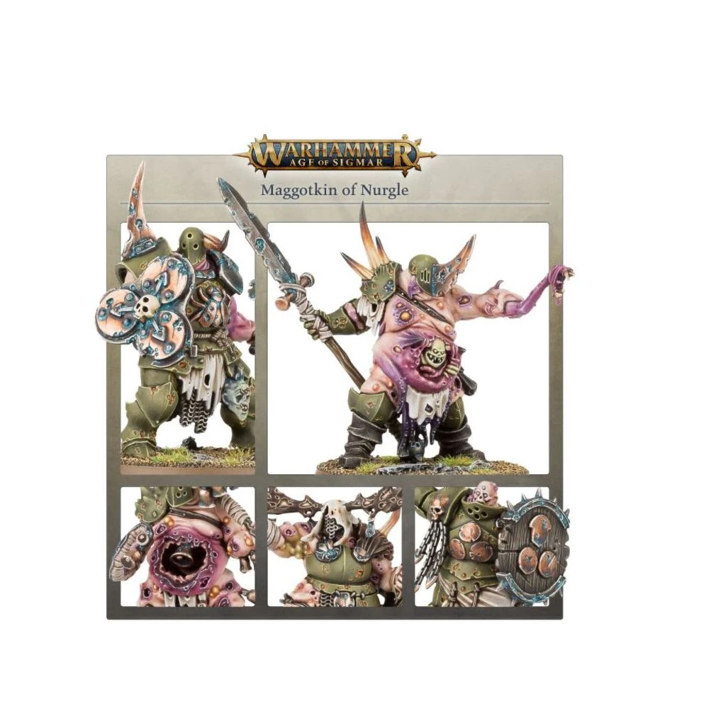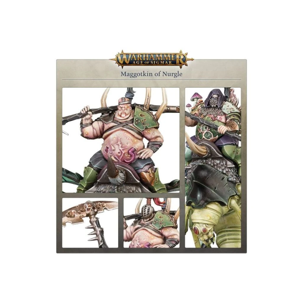 S’il y a une constante de l’existence, c’est bien la décrépitude. Toute chose finit par se plier à l’entropie. Aucune des Puissances de la Ruine ne le comprend mieux que Nurgle. Maître du Carnaval Moisi, Nurgle a mille identités, mais pour ses adorateurs, c’est juste « Grand-père ». Au son du bourdonnement d’un million de mouches, ses armées de fidèles Putrescents marchent pour répandre les pestes et les poisons, soufflant l’espoir à l’aide de lames rouillées et de sortilèges infects.