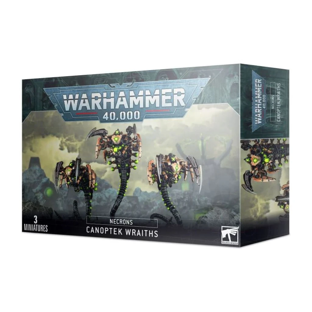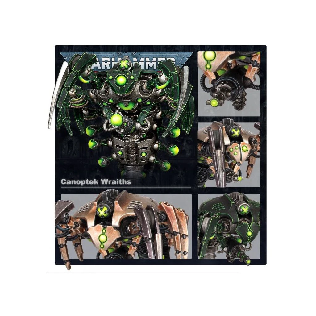 Lorsqu’un monde-nécropole est endormi, les Canoptek Wraiths sont ses yeux et ses oreilles. Ils planent dans les halls poussiéreux, guettant les intrus et vérifiant le bon fonctionnement des systèmes. La caractéristique la plus remarquable du Canoptek Wraith est sa matrice de déstabilisation dimensionnelle: un disrupteur de phase qui lui permet d’effectuer des bonds dans et hors de la réalité. Cette matrice a d’abord été conçue pour permettre aux Wraiths d’atteindre l’intérieur des machines pour les réparer, mais cette capacité est tout aussi appréciable pour s’occuper des intrus. Un Canoptek Wraith peut déphaser ses tentacules griffus à l’intérieur de son adversaire et de les resolidifier pour trancher artères, tendons et autres organes sans laisser la moindre plaie externe.