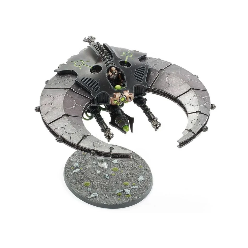 Le Necron Doom Scythe, avec sa forme de croissant, est un engin impressionnant. Sa coque racée est couverte d’iconographie Necron, avec un moteur pareil à une colonne vertébrale ainsi que divers orbes et grilles. Le pilote Necron est niché dans un habitacle au cœur de l’aéronef, qui est armé de destructeurs Tesla et d’un rayon de mort enserré dans un étau.