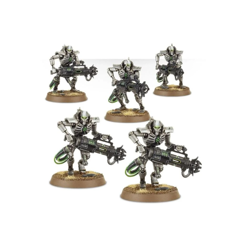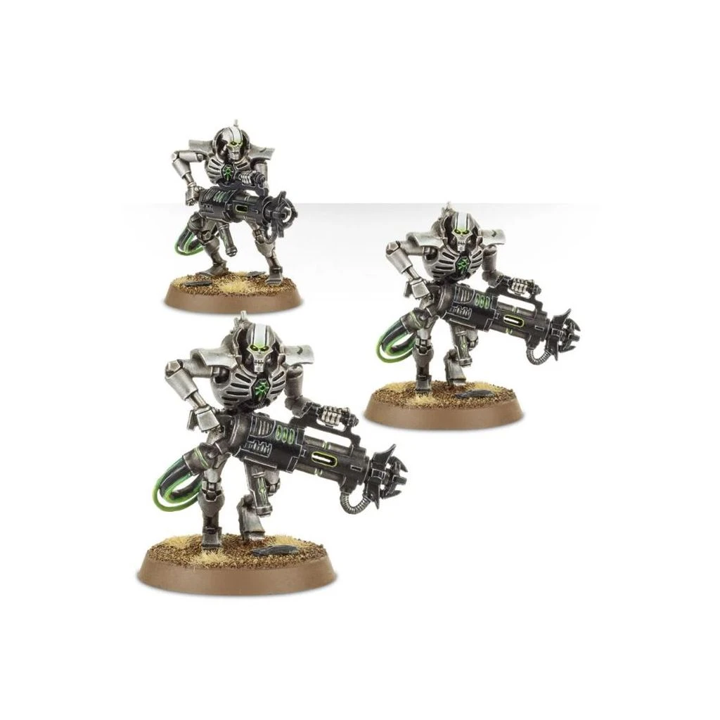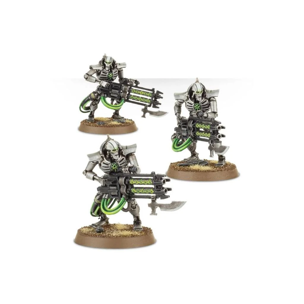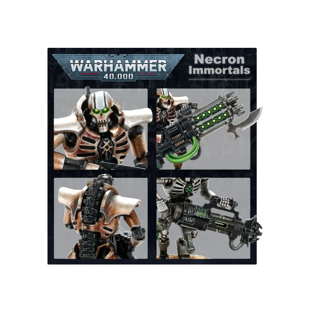Les Necron Immortals ont le physique classique de squelette de métal propre à leur race. Leurs longs membres ont des écrous en guise d’articulations, leur posture voûtée les rend encore plus inquiétants, et leur tête est encastrée dans un logement blindé qu’encadrent leurs épaisses épaulières usinées. Leur plastron est frappé d’une sobre iconographie Necron. Les Immortals peuvent être équipés de terribles éclateurs gauss ou de carabines tesla.