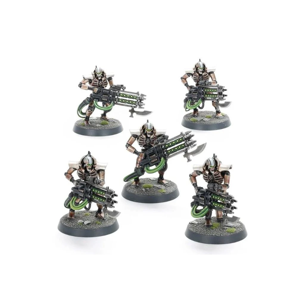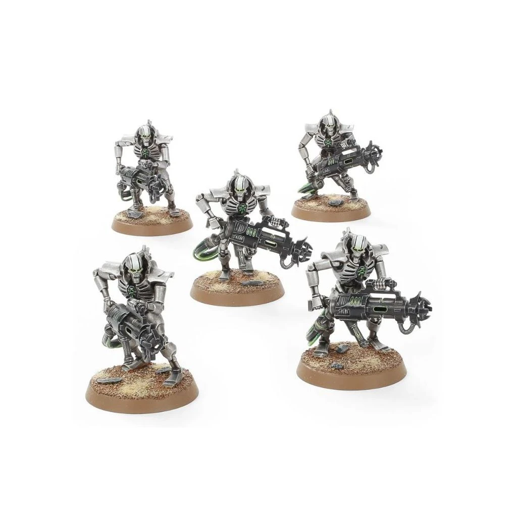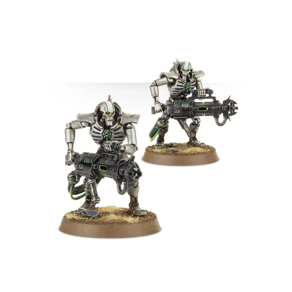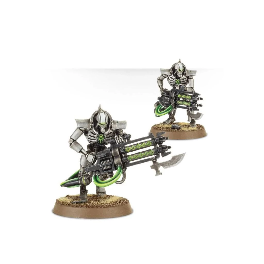 Les Necron Immortals ont le physique classique de squelette de métal propre à leur race. Leurs longs membres ont des écrous en guise d’articulations, leur posture voûtée les rend encore plus inquiétants, et leur tête est encastrée dans un logement blindé qu’encadrent leurs épaisses épaulières usinées. Leur plastron est frappé d’une sobre iconographie Necron. Les Immortals peuvent être équipés de terribles éclateurs gauss ou de carabines tesla.