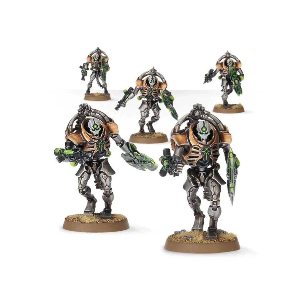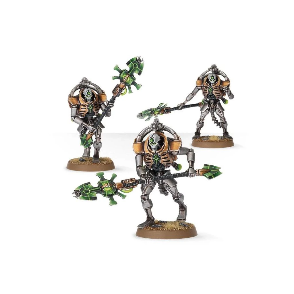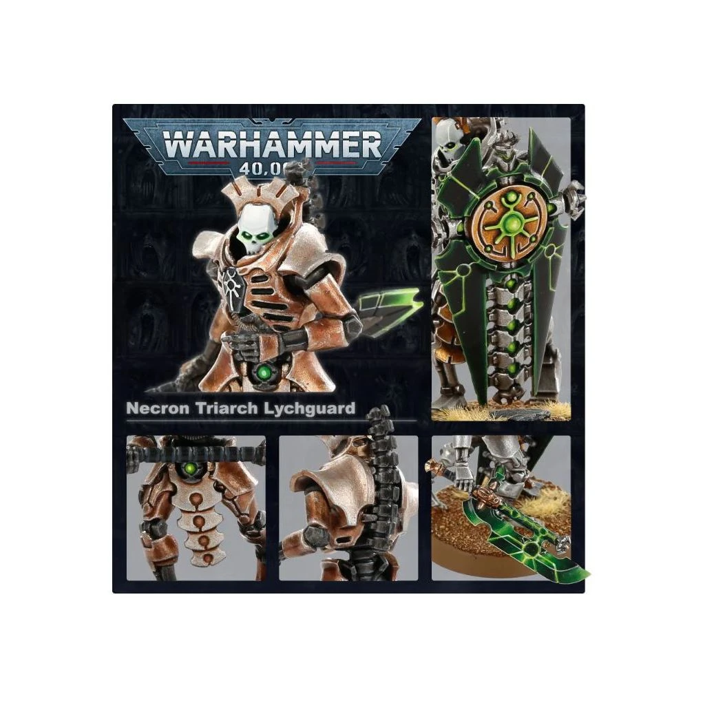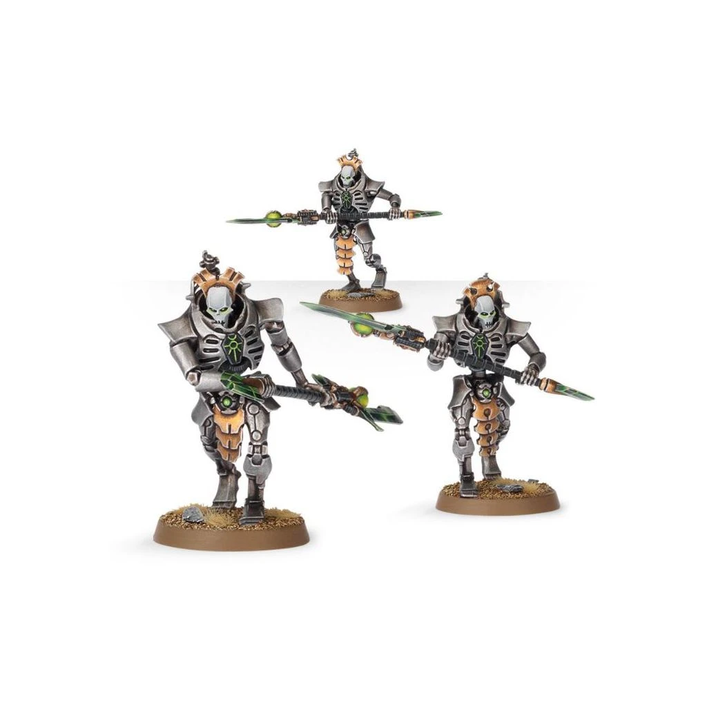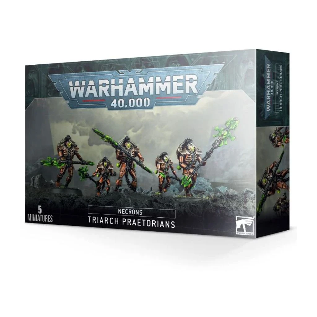 Les figurines de ces prétoriens du Triarcat sont hautement détaillées et portent fièrement la riche iconographie et les glyphes des dynasties nécrons sur leur armure. Leur corps a la silhouette squelettique caractéristique des nécrons, mais ils portent en plus de pagnes de plaques de métal segmentées, et manient des armes massives. Les prétoriens du Triarcat portent traditionnellement une crosse d’alliance, qu’ils échangent parfois contre une lame du néant et un projecteur de particules.