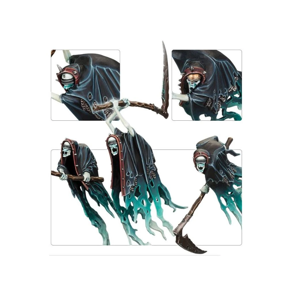 De leur vivant, les Grimghast Reapers étaient des tueurs prudents et méticuleux. Dans la mort, ils ne cessent jamais de trancher l’air de leurs armes et fauchent impitoyablement et inlassablement l’ennemi, un rang après l’autre. Comme d’horribles automates, ils répètent sans cesse leurs mouvements déchirants et fatals. Ces spectres sont vifs, mais lorsqu’ils se fendent pour attaquer, leurs mouvements sont saccadés, à l’opposé de la grâce des gestes des vivants. Ils semblent se déplacer par à-coups convulsifs, et avec une rapidité déconcertante.