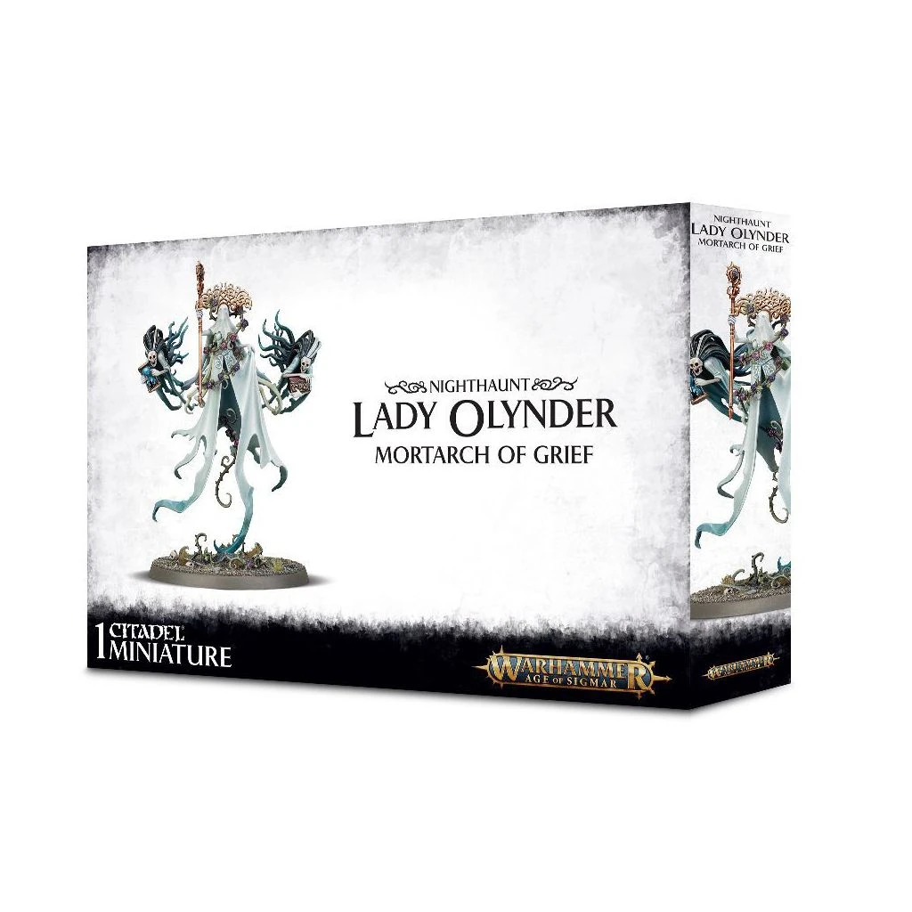Ce kit plastique contient les composants nécessaires pour assembler Lady Olynder, Mortarch of Grief. En tant que Mortarch du Deuil, elle est nimbée d’une aura de chagrin absolu – cette figurine évoque une profonde tristesse. Flottant au-dessus du sol avec sa robe de mariage et sa voilette de mauvais augure, on ne distingue d’elle que les contours de son crâne. Sa traîne nuptiale en lambeaux ondoie derrière elle et les haillons éthérés rattachent la figurine à son socle. Des roses funéraires épineuses, qui poussent où qu’elle se trouve, lui ceignent la taille et remontent jusqu’à lui faire une couronne d’épines. Elle tient dans sa main droite le Bâton de Minuit, un sceptre ouvragé surmonté d’une gemme polie en sable sépulcral vitrifié. Elle est accompagnée de 2 macabres Demoiselles de Compagnie Banshees, d’horribles spectres au faciès squelettique. Elles portent des présents – un sablier sépulcral ensorcelé offert par Nagash en personne et qui peut être brisé avec des conséquences tragiques, ainsi qu’un cercueil fermé au contenu énigmatique; en tout cas rien qui promette d’être vraiment réjouissant…