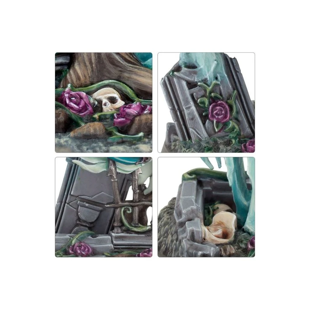 Ce kit est fourni en 16 composants, plus 4 socles ronds sculptés de 32mm. Ces derniers dépeignent une scène sépulcrale jonchée d’ossements, de bris de statue et de roses, le cimetière où planent les Banshees.