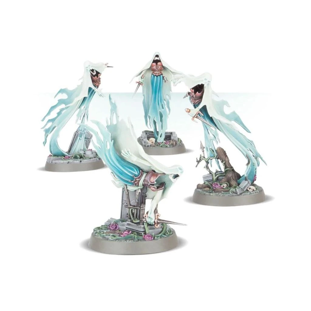 Sinistres et hurlantes, les Myrmourn Banshees sont un kit de 4 figurines Nighthaunt irradiant le désespoir, qui ne sont guère plus que des corsets vides entourés de vapeurs éthérées, et des suaires couvrant des crânes figés dans un rictus. Elles filent dans l’air, intangibles, en serrant leurs dagues de givre, et toutes sont visiblement désincarnées, comme le montre le vide de chaque figurine.