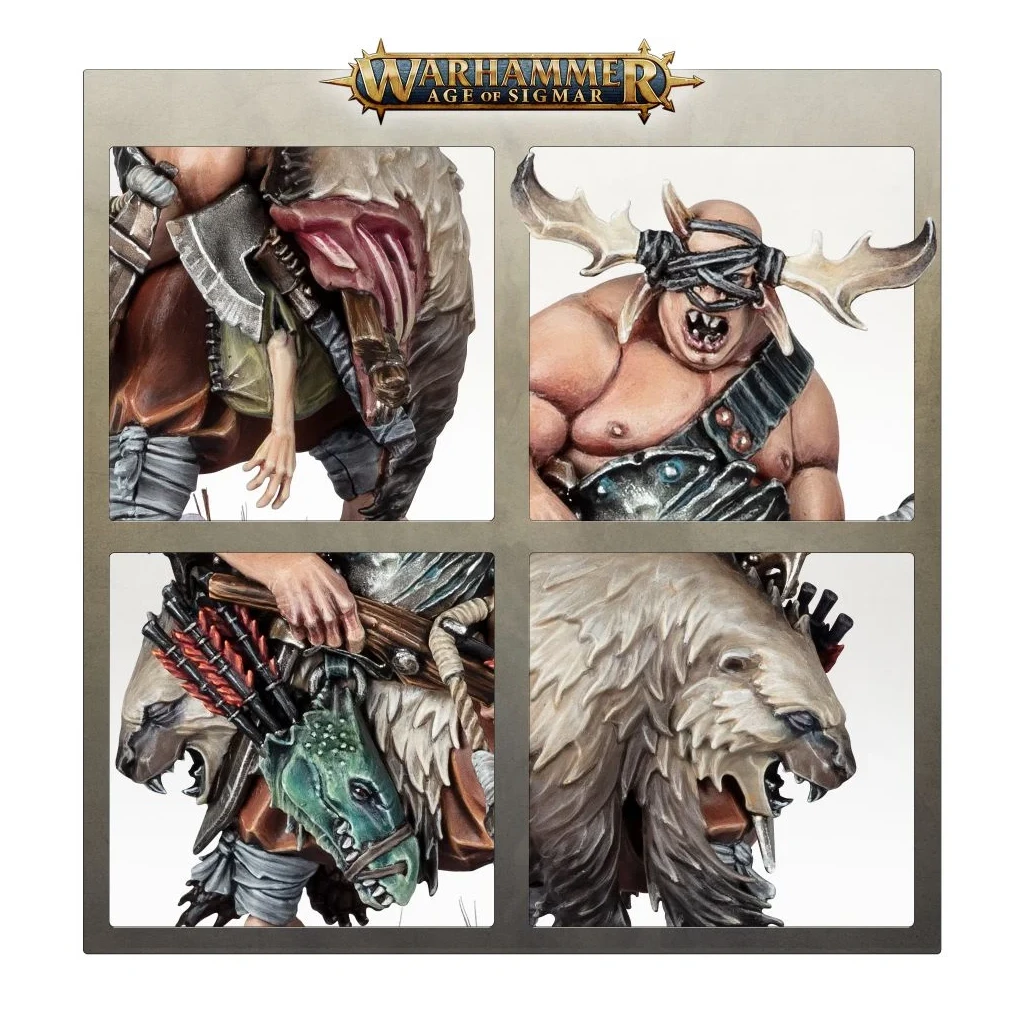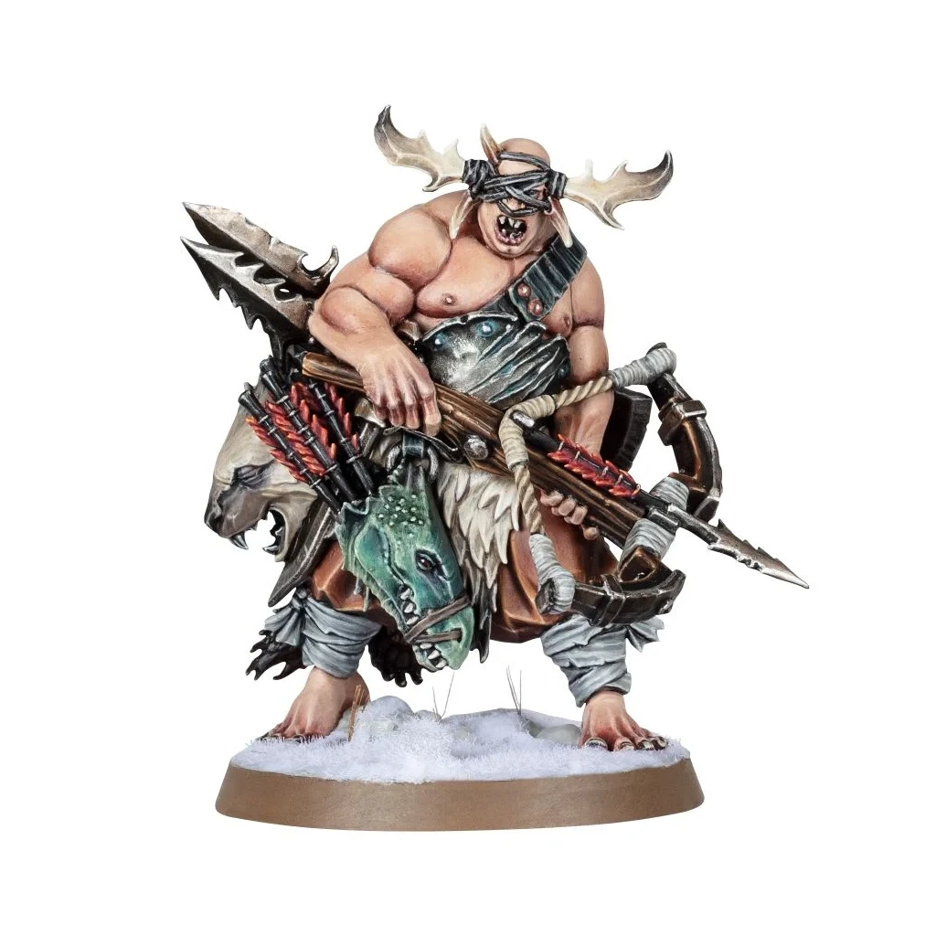Ce kit plastique permet d’assembler un Chasseur de Massacres, un tueur de bêtes pour les Hordegueules Ogors. Cette figurine est couverte de trophées prouvant ses talents de pisteur vétéran, des peaux et morceaux de chair à moitié mangés à la tête de reptile qu’il utilise comme carquois. Il marche pieds nus pour rester discret et arbore une ramure sur le dos pour se camoufler jusqu’à ce qu’il puisse utiliser ses lances barbelées et ses carreaux d’arbalète pour abattre sa proie.
