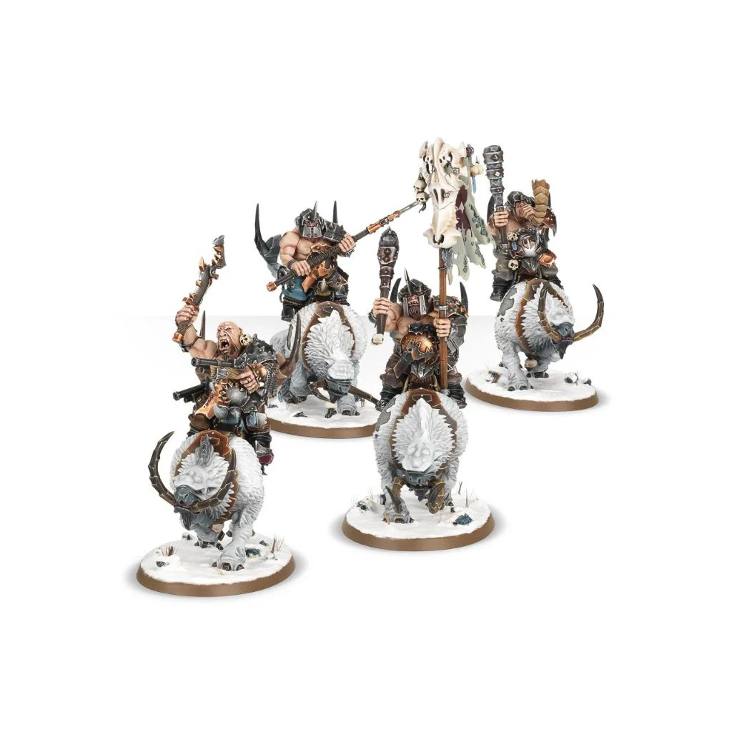Ossature des Beastclaw Raiders Alfrostun, Les Ogors montés sur Mournfangs sont invariablement à l’avant-garde des raids. Armés de massues, de tranchoirs et de pistolets, ils sont extrêmement doués pour bloquer l’attaque ennemie avant de s’adonner à une vraie boucherie. Leurs montures sont tout aussi redoutables, et elles réduisent en charpie tout ce qui a le malheur de croiser leur route.