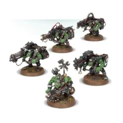 Ces figurines d’orks musculeux portent, en guise d’armes, toutes sortes de bricolages dangereux à l’aide de sangles grossières et de harnais pesants. Certains sujets portent des masques ou des lunettes d’étrange facture, et les mékanos ont des outils en guise de signe distinctif. On entrevoit le sourire cruel des pillards au milieu du harnais de kanon eud’la mort, qui est pour eux une source d’intense satisfaction.