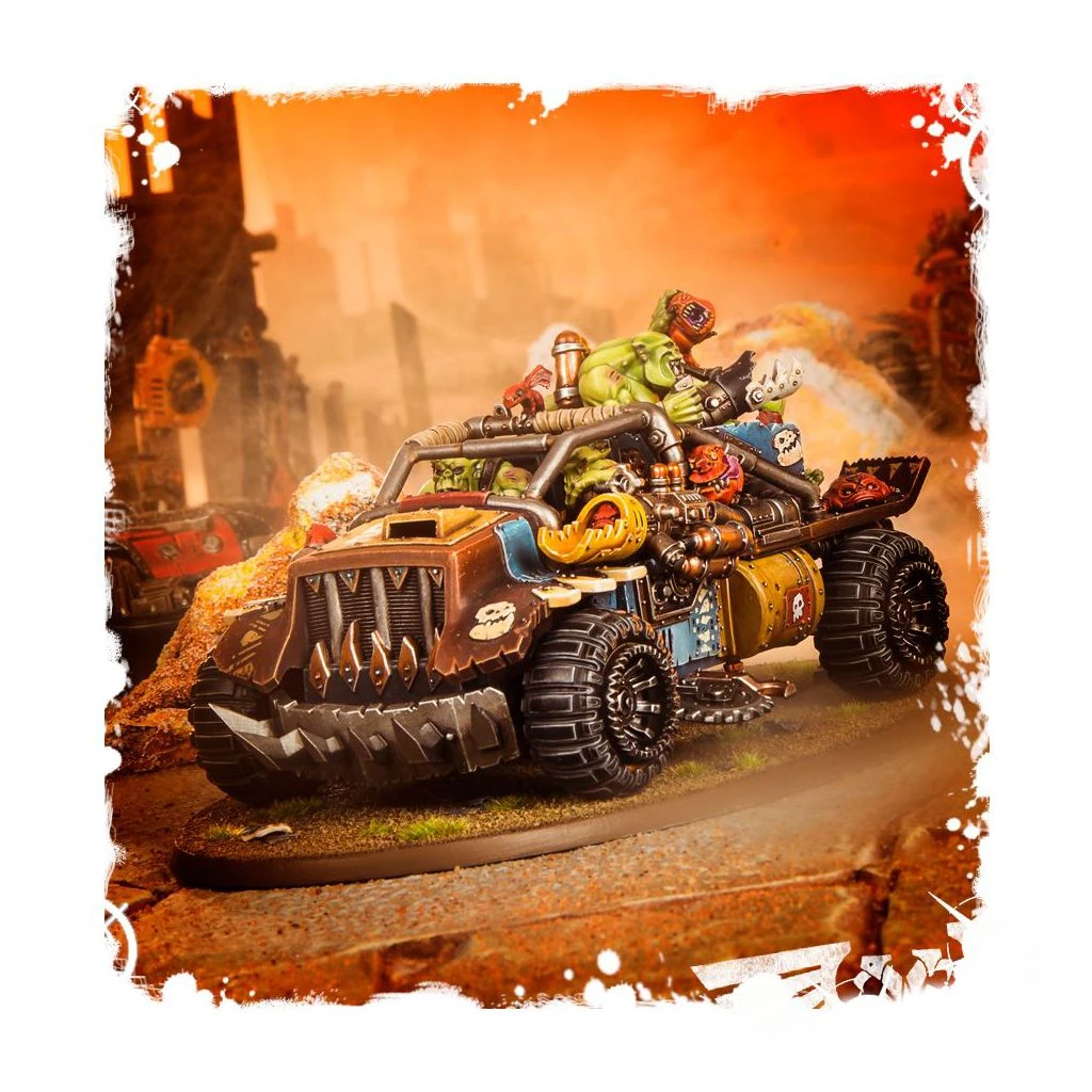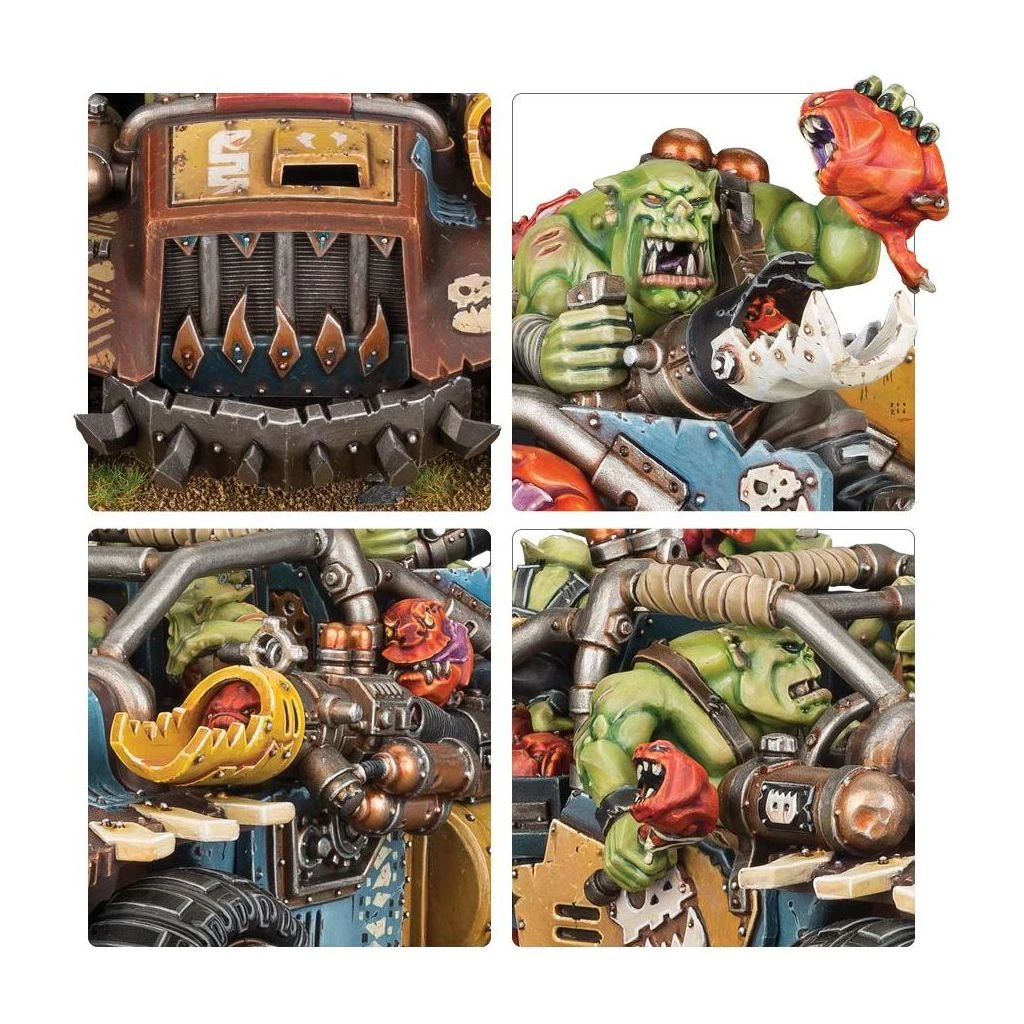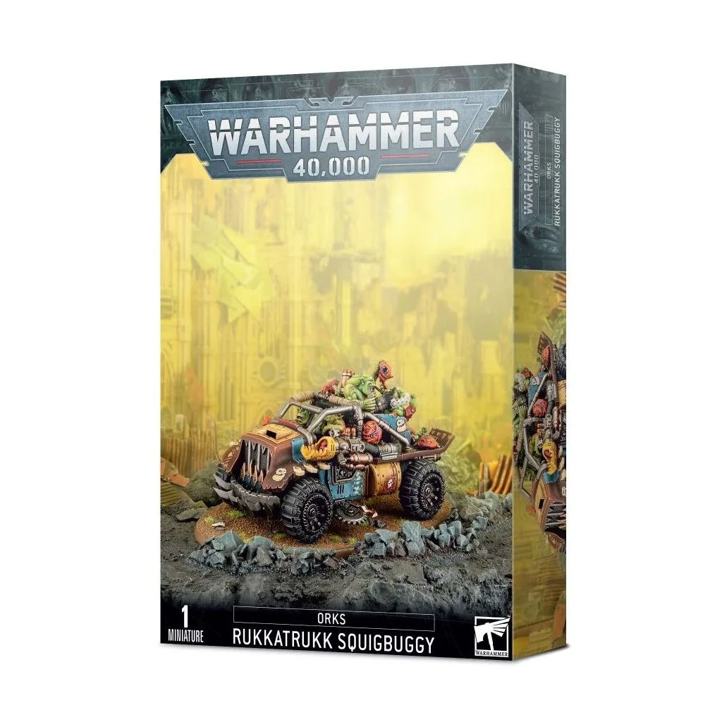 Ce kit plastique contient les composants nécessaires pour assembler un Rukkatrukk Squigbuggy. De construction robuste pour un véhicule léger ork – tout en présentant les caractéristiques d’une machine faite par des Meks qui usent de leur marteau plus que de leur cerveau – le Squigbuggy est une sorte de pick-up avec un large empattement, qui peut parcourir un terrain accidenté sans se retourner trop souvent. Son plateau accueille un enclos grouillant de toute une ménagerie de squigs-bile, squigs-boum et squigs voraces, sous la garde d’un Grot (qui a toutes les peines à les gérer). Un Ork à la solide carrure se tient en équilibre précaire et fourre un squig dans le lanceur qu’il pointe tant bien que mal. Sous le plateau, il y a deux réservoirs pas spécialement protégés contre les impacts, et des lames de scie de chaque côté, pour déchiqueter les pneus ou les piétons ennemis. Dans l’habitacle, qui se résume à une sorte de cage autour du volant, se trouvent le conducteur et un passager. Tous deux portent les stigmates de morsures et de griffures témoignant d’un métier en contact avec les squigs, le passager ork agrippant le mécanisme de mise à feu de son lance-squigs. En guise de grille de radiateur, l’avant du Squigbuggy présente une gueule aux crocs acérés – plus un éperon pour faire bonne mesure.
