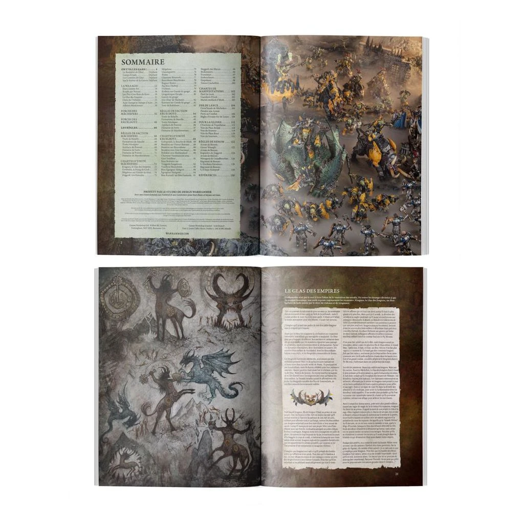 – Des règles de faction comprenant des traits de bataille, des formations de bataille, des traits héroïques, des artefacts de pouvoir, ainsi que les Sorts et Manifestations des Mâchefers et des Kruelboyz