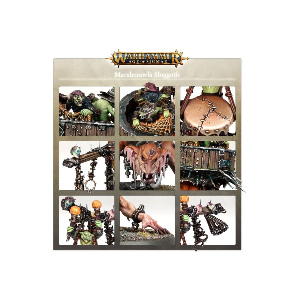 Bien que principalement destiné à capturer des bêtes et des gens pour divertir les Kruelboyz, l’équipage d’un Sloggoth des Marais martèle par ailleurs un rythme qui imite le choc des sabots de Kragnos, Glas des Empires et dieu vivant de la Destruction, tel qu’il résonne à travers les Royaumes Mortels en rendant frénétiques les orruks et leurs alliés. Généralement éloignés de la ligne de front, les chopeurs grots poussent leurs Sloggoths à éliminer les individus vulnérables, tout en s’assurant qu’autour d’eux la Waaagh! demeure stimulée par le son du tambour.