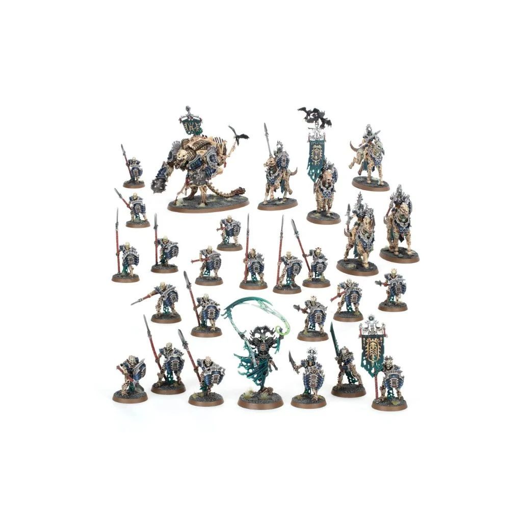 Si vous souhaitez imposer la perfection de la mort sur les Royaumes Mortels, cette boîte est un point de départ idéal pour une armée de Collecteurs Ossiarques, ou un très bon moyen d’étoffer une force existante. Elle vous permettra en outre de faire des économies par rapport à un achat des kits au détail. Un Faucheur d’Âmes Mortisan mène une grande formation de Gardes Morteks qui vous servira d’unité de Ligne. Ils sont soutenus par de prestes Juchemorts Kavalos et un colossal Moissonneur Gothizzar capable de démembrer les adversaires les plus robustes. C’est une armée entière dans une boîte, avec laquelle vous pourrez prélever votre dîme d’os dans vos parties de Warhammer Age of Sigmar.