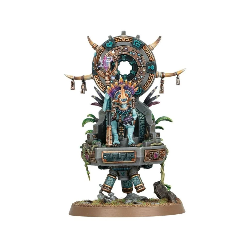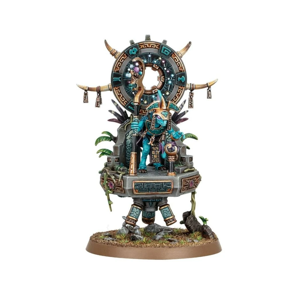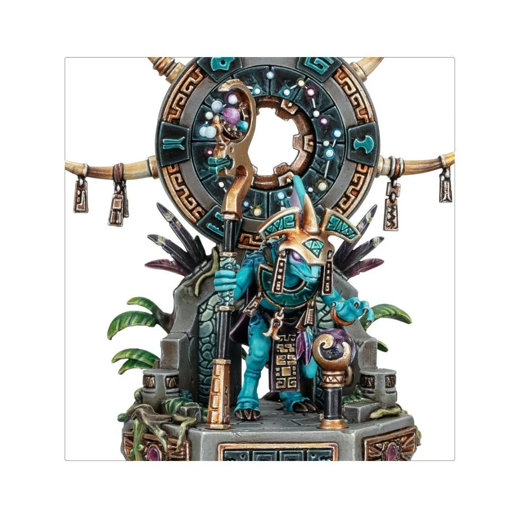 Ce kit plastique permet d’assembler un Astromancien Skink, un astrologue ésotérique sis sur un palanquin flottant. Le kit permet d’assembler l’Astromancien dans deux poses différentes: une dressée et drapée d’une cape de plumes, et une autre assise avec ses robes répandues autour de lui. Ces deux options sont équipées d’un bâton d’astromancien offrant un choix de deux têtes de planétaire, et le kit propose divers colliers ornementaux et coiffes de prêtre.