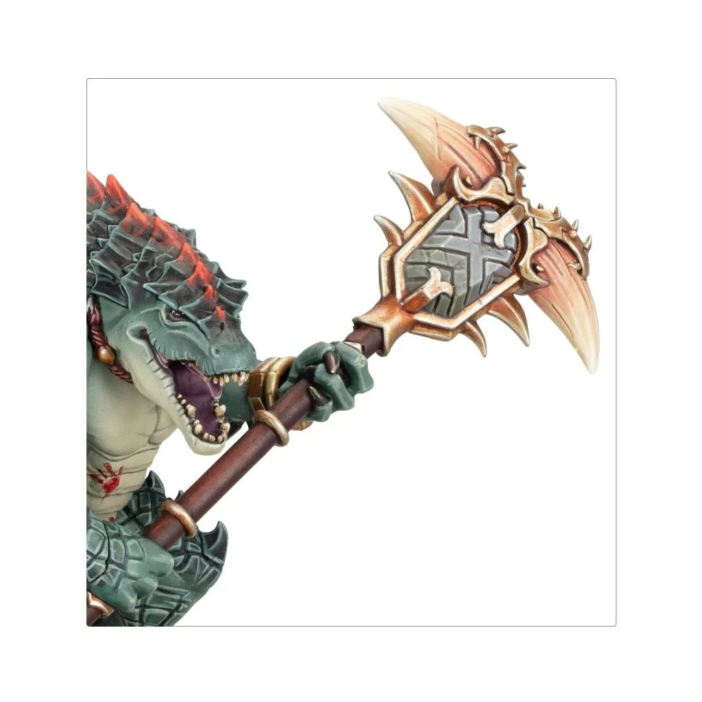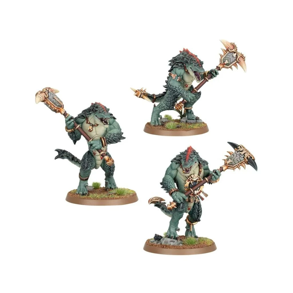 Ce kit plastique permet d’assembler trois Kroxigors, des Séraphons musculeux qui dominent les ennemis plus petits. Chaque Kroxigor manie une massue mors-drac, et l’un d’eux peut à la place être armé d’un marteau de pierre lunaire. Le kit propose une grande quantité d’options esthétiques: chaque Kroxigor dispose d’un choix de deux têtes à l’épaisse crête d’écailles, et deux positions de bras brandissant son arme imposante. Ce kit contient également trois têtes de massues distinctes et cinq pointes de queue osseuses adaptées à toutes les figurines, ainsi que divers colliers et éléments de socle scéniques.