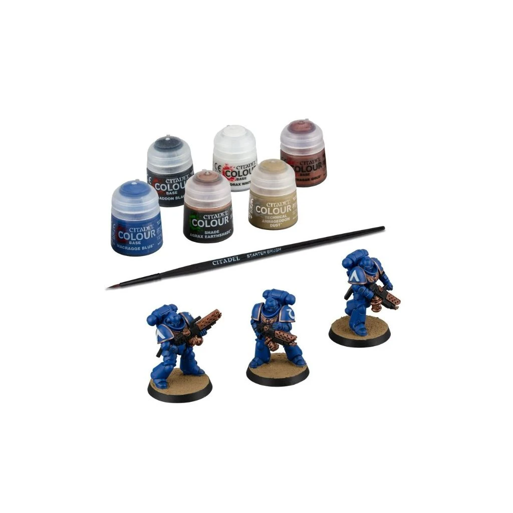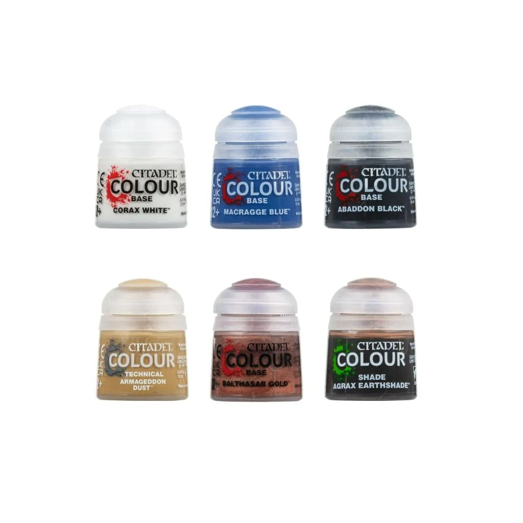 Les six peintures Citadel Colour sont fournies en pots de 12ml et proposent les principales couleurs nécessaires pour peindre ces figurines aux couleurs des Ultramarines, ainsi qu’une peinture Technical pour créer un socle texturé: