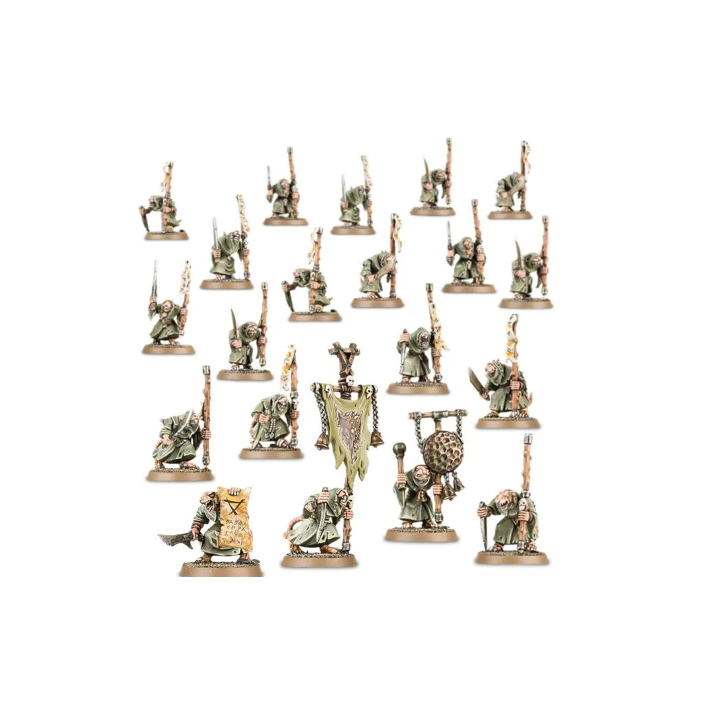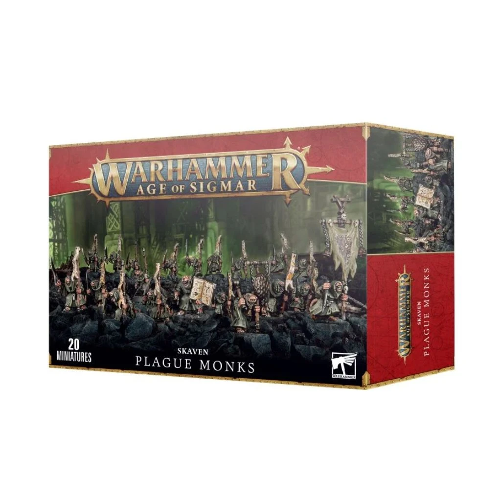 Ce kit plastique vous fournit tout le nécessaire pour monter une horde couinante de vingt Plague Monks, avec l’option de les armer d’une paire de lames fétides ou d’une lame fétide et d’un bâton des plaies. Une des figurines peut devenir le Bringer-of-the-Word, doté d’un Parchemin de la Peste ou d’un Livre des Plaies. Une autre figurine peut devenir un porte-icône avec Bannière de Contagion ou Icône de Pestilence, et une autre encore peut être montée en tant que héraut de la peste, portant un Gong de Dégoût ou un redoutable Carillon d’Escarres.