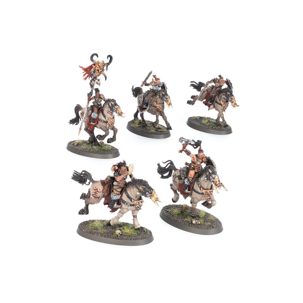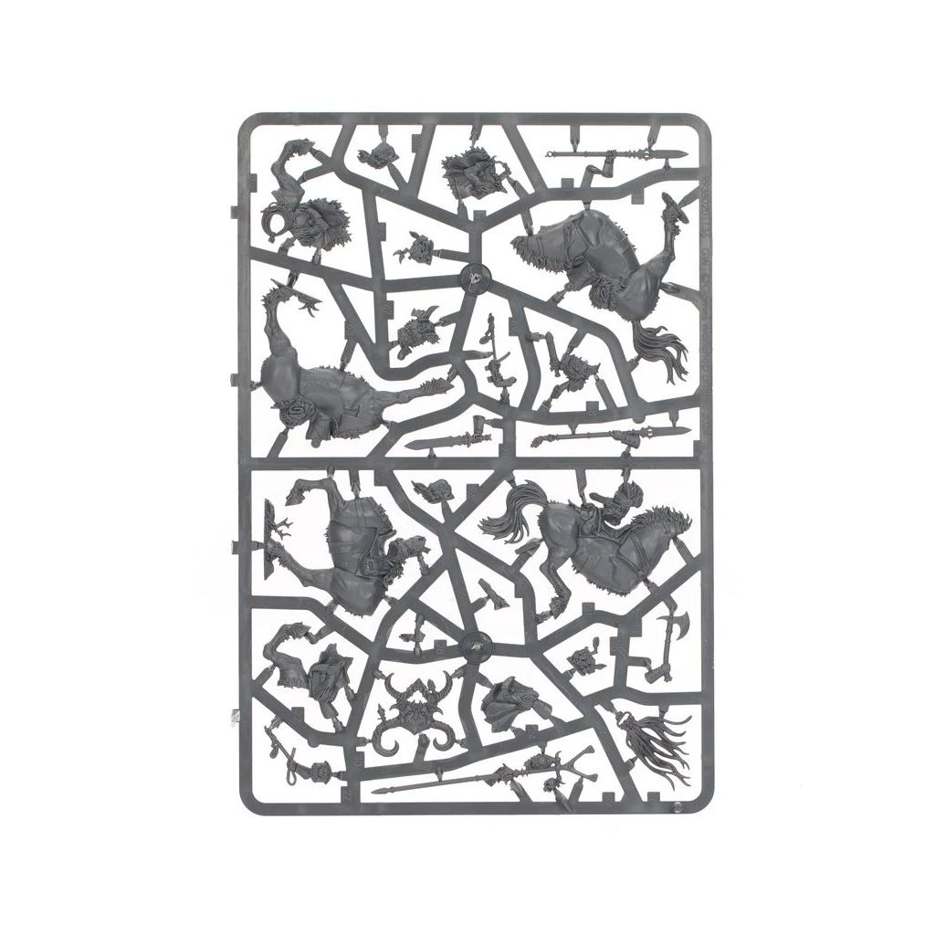 Ce kit en plastique permet d’assembler cinq Cavaliers Cruels Noir-serment, de prestes pillards montĂ©s qui combattent pour les Esclaves des TĂ©nĂšbres. Les Cavaliers Cruels portent de robustes rondaches et peuvent ĂȘtre armĂ©s de javelines de pillards ou de diverses haches et spathes de pillards. Le kit contient Ă©galement les options nĂ©cessaires pour assembler une figurine comme Champion Noir-serment avec une museliĂšre unique pour son cheval, ainsi qu’un musicien Sonneur de Cor et un porte-Ă©tendard brandissant une terrifiante icĂŽne dĂ©moniaque.