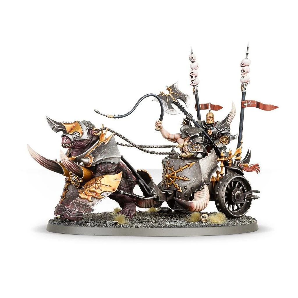 Engins de mort tractés par des chevaux musclés et agressifs, les Chaos Chariots foncent vers la mêlée à une vitesse insensée, et leur impact se traduit par des projections d’os brisés et de chair déchiquetée. Les cochers manient leur fouet barbelé en experts, tant pour exciter leurs bêtes que pour lacérer les ennemis avec une joie malveillante. Un simple Chaos Chariot peut balayer un mur de boucliers comme de la poussière, tant ses roues garnies de lames et les sabots de ses chevaux sont mortels.