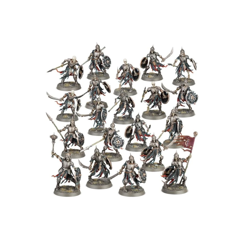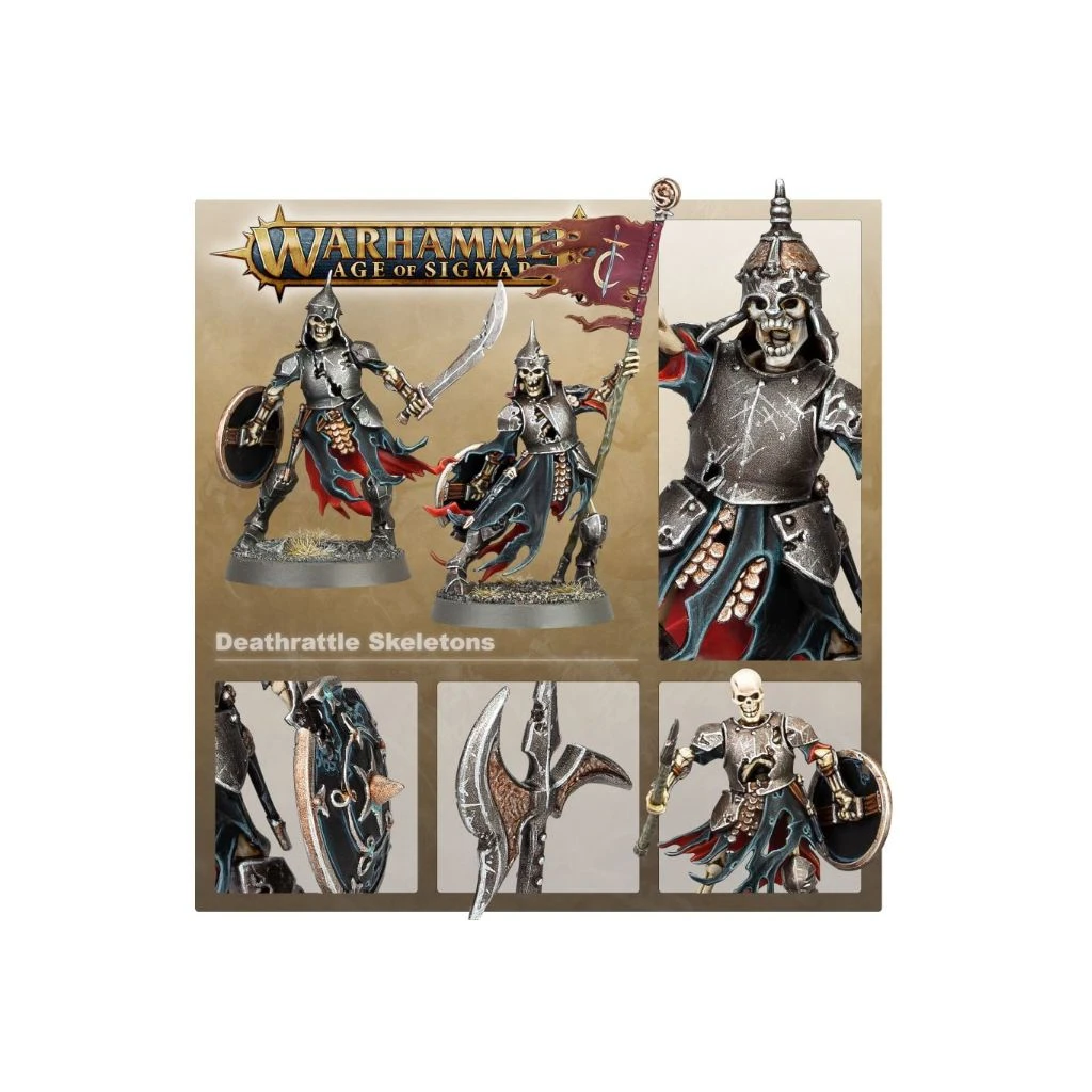 S’ils ne sont pas vraiment des soldats reluisants, les Deathrattle Skeletons progressent sur le champ de bataille telle une marée d’os et de fer, de sorte que leur effectif compense leurs lacunes. Même les adversaires qui croient avoir abattu ces ennemis sans âme se rendent compte que la nécromancie de Shyish perdure, et que les squelettes se relèvent pour riposter.