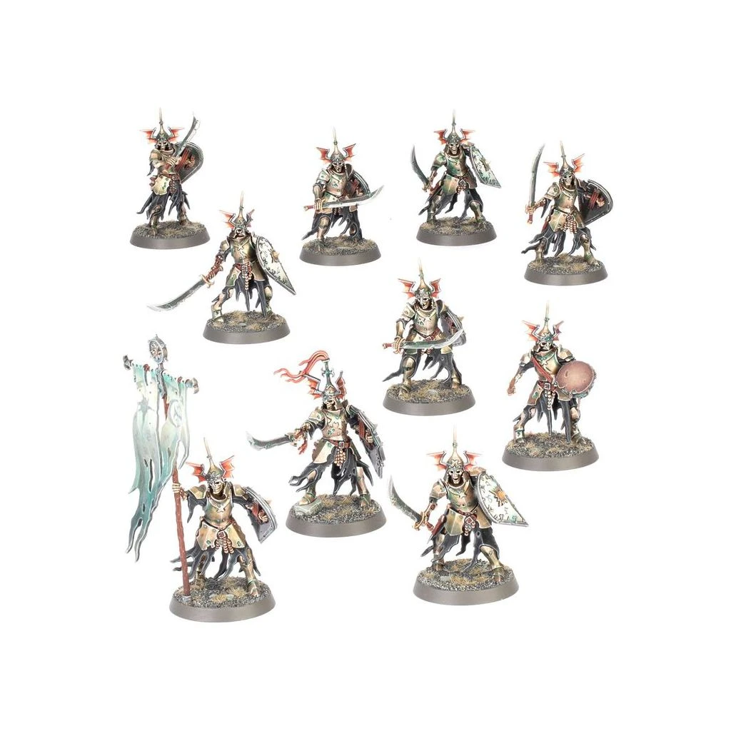 Les hordes des Râclemorts sont des squelettes de soldats animés par la nécromancie la plus noire, et qui demeurent obnubilés par la conquête. Rien ne les arrêtera avant qu’ils n’aient intégralement terrassé leurs adversaires. Leurs lames rouillées taillent encore profond, leurs armures incrustées de patine continuent de détourner les coups, et jamais ils ne faiblissent ni ne se fatiguent.