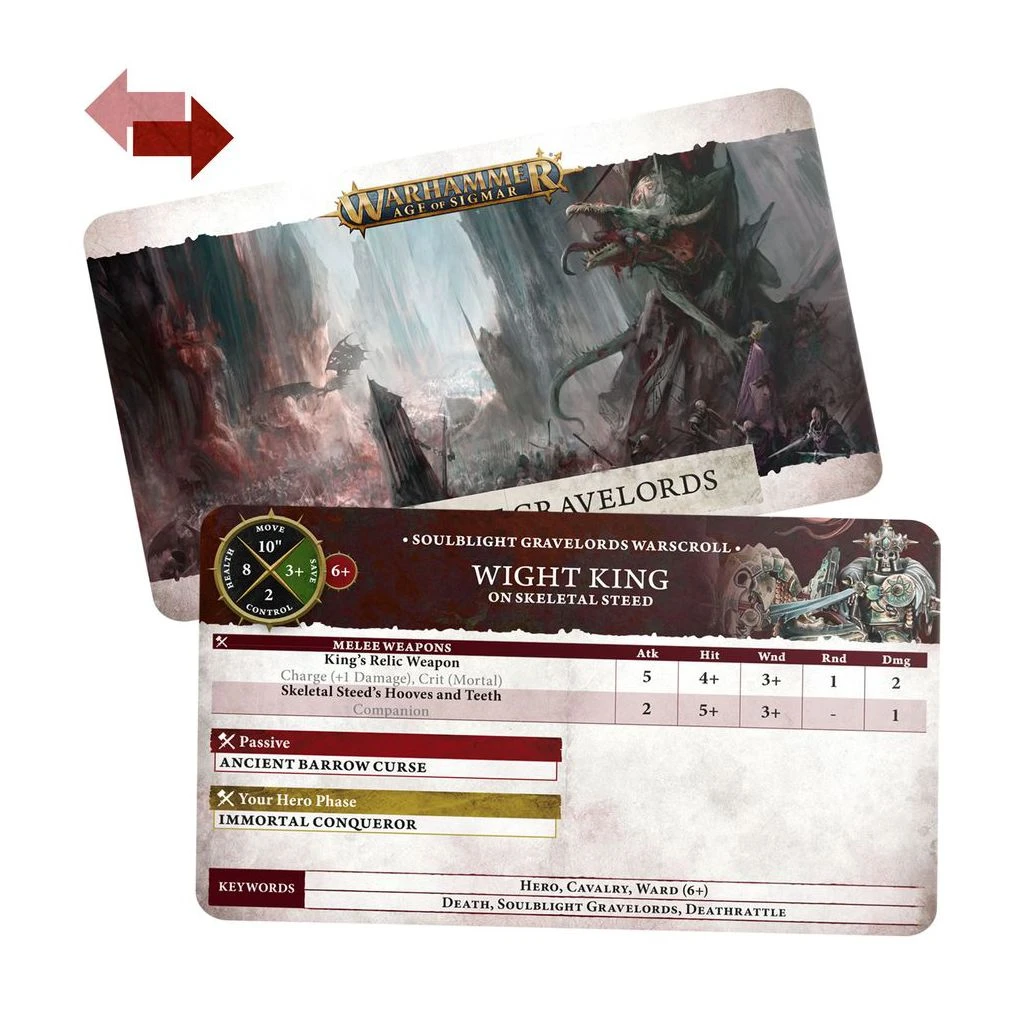 – Les Cartes de charte: Soulblight Gravelords – 55 cartes, incluant les cartes de Régiment de Renom, les cartes d’Armée de Renom, les cartes de Règles de Faction, les cartes de Fer de Lance, et les cartes de charte des Seigneurs Ruinemânes