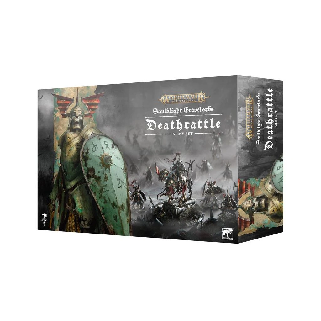 – Le Tome de Bataille de la Mort: Soulblight Gravelords – un livre relié de 122 pages avec des détails dorés à effet vert-de-gris, une dorure sur tranche, un couverture soyeuse et un ruban marque-page noir