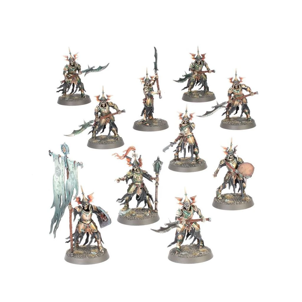 Les hordes des Râclemorts sont des squelettes de soldats animés par la nécromancie la plus noire, et qui demeurent obnubilés par la conquête. Rien ne les arrêtera avant qu’ils n’aient intégralement terrassé leurs adversaires. Leurs lames rouillées taillent encore profond, leurs armures incrustées de patine continuent de détourner les coups, et jamais ils ne faiblissent ni ne se fatiguent.