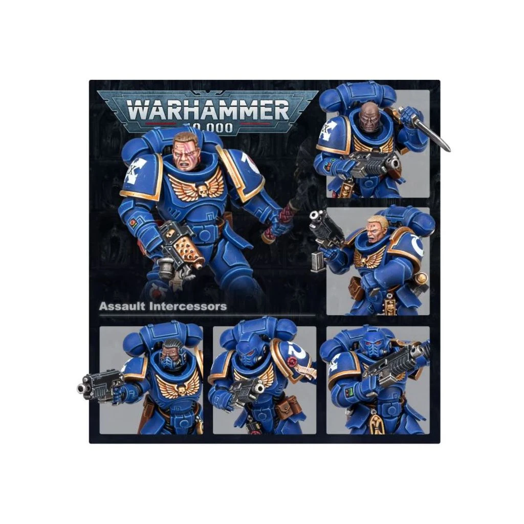 Les Intercessors d’Assaut sont une des unités de combat rapproché les plus répandues dans l’arsenal chapitral. Ils se ruent vers l’ennemi en faisant feu de leurs pistolets bolters lourds, et une fois au contact, ils éliminent promptement toute adversité à grands coups d’épées tronçonneuses.
