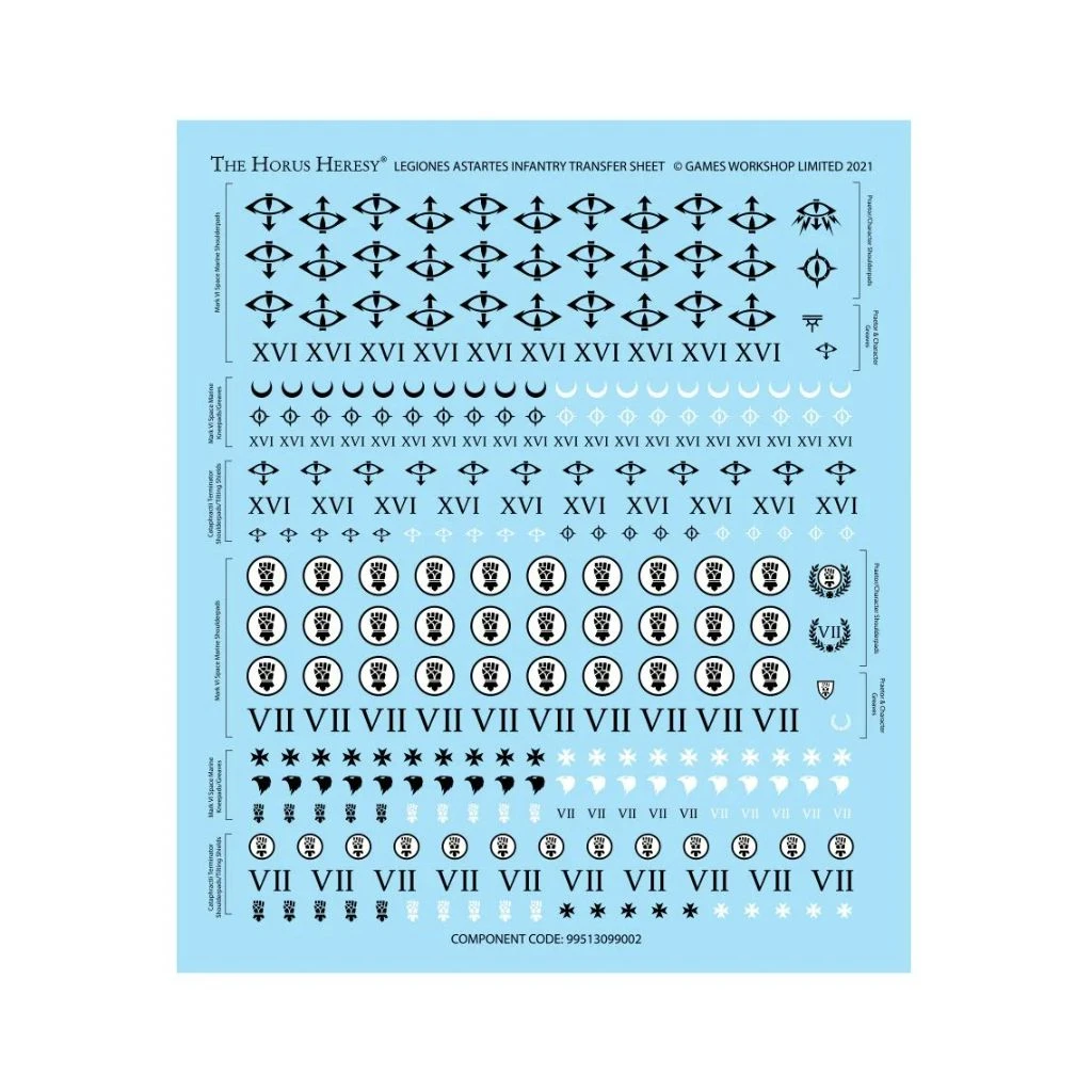 Ces figurines n’ont aucun marquage de Légion, ce qui permet aux hobbyistes Warhammer de les peindre de la couleur de leur choix. Cependant, la boîte contient une planche de décalcos de 293 marquages et icônes optionnels pour les Légions des Sons of Horus et des Imperial Fists.