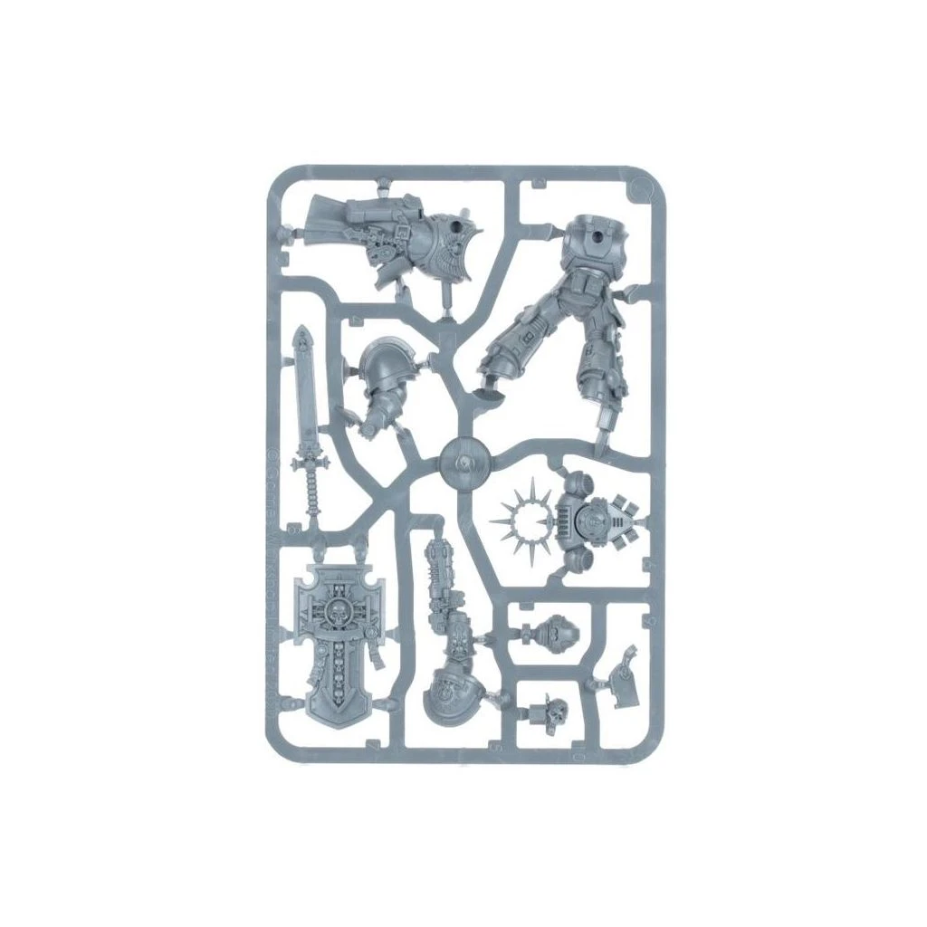 Ce kit plastique permet d’assembler un Lieutenant Space Marine portant un bouclier Storm. Ce sous-commandant émérite de l’Adeptus Astartes est également armé d’un pistolet néo-volktie rare et exotique, ainsi que d’une épée énergétique rangée dans son fourreau à la ceinture. L’armure de ce meneur agressif comporte un tabard et est ornée de reliques et de symboles de son statut, ce qui l’identifie clairement comme un vétéran, tandis que son bouclier Storm est frappé du signe de la Croisade Indomitus.