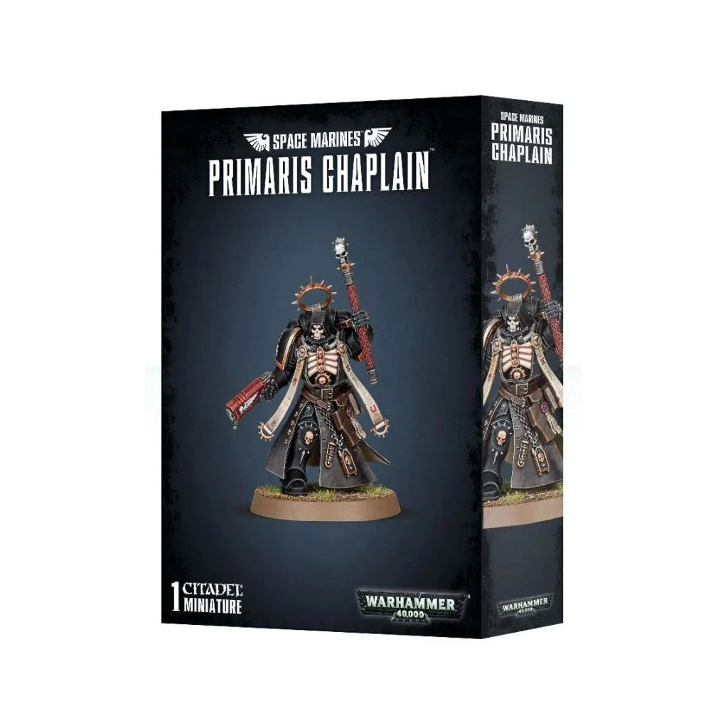Ce kit plastique contient les composants nécessaire pour assembler un Primaris Chaplain. Dans son armure énergétique Mk X noire de jais aux jambières caractéristiques, il manie avec ferveur son pistolet bolter Absolvor et son crozius arcanum. Sa bure encapuchonnée lui donne un air lugubre prononcé, ce que confortent les pointes, chaînes, crânes et sceaux de pureté dont il est bardé. Son heaume en forme de crâne et son plastron en forme de cage thoracique évoquent la mort qui guette ses ennemis. Son paquetage dorsal comporte un rosarius dont les 12 pointes représentent les Hauts Seigneurs de Terra.