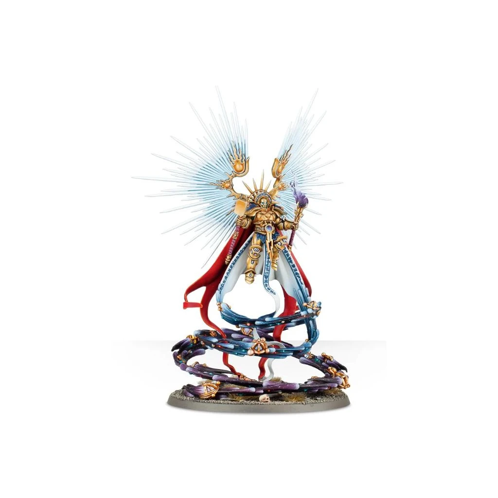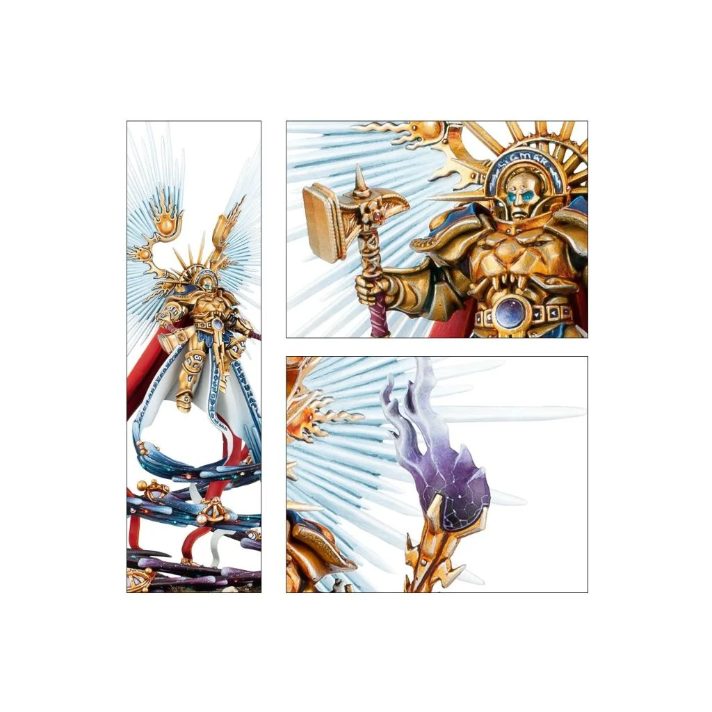 La colère du Dieu-Roi. L’Ange Vengeur d’Azyr. Le Porteur du Marteau Monde. Le Premier Fils de Sigmar – tel est le Celestant-Prime. Grand roi et dĂ©fenseur des hommes au temps de sa vie de mortel, il a Ă©tĂ© prodigieusement galvanisĂ© par la puissance divine de Sigmar; et pourtant, ce don de pouvoir ne s’arrĂŞte pas lĂ . DĂ©sormais nanti du Fendeur de Crânes, le Grand Broyeur Ghal Maraz, le Celestant-Prime rugit de fureur Ă travers les champs de bataille des Royaumes, tel un appel aux armes retentissant. L’impact fracassant de Ghal Maraz peut tuer net un dĂ©mon, bannissant son esprit vers le Royaume du Chaos.