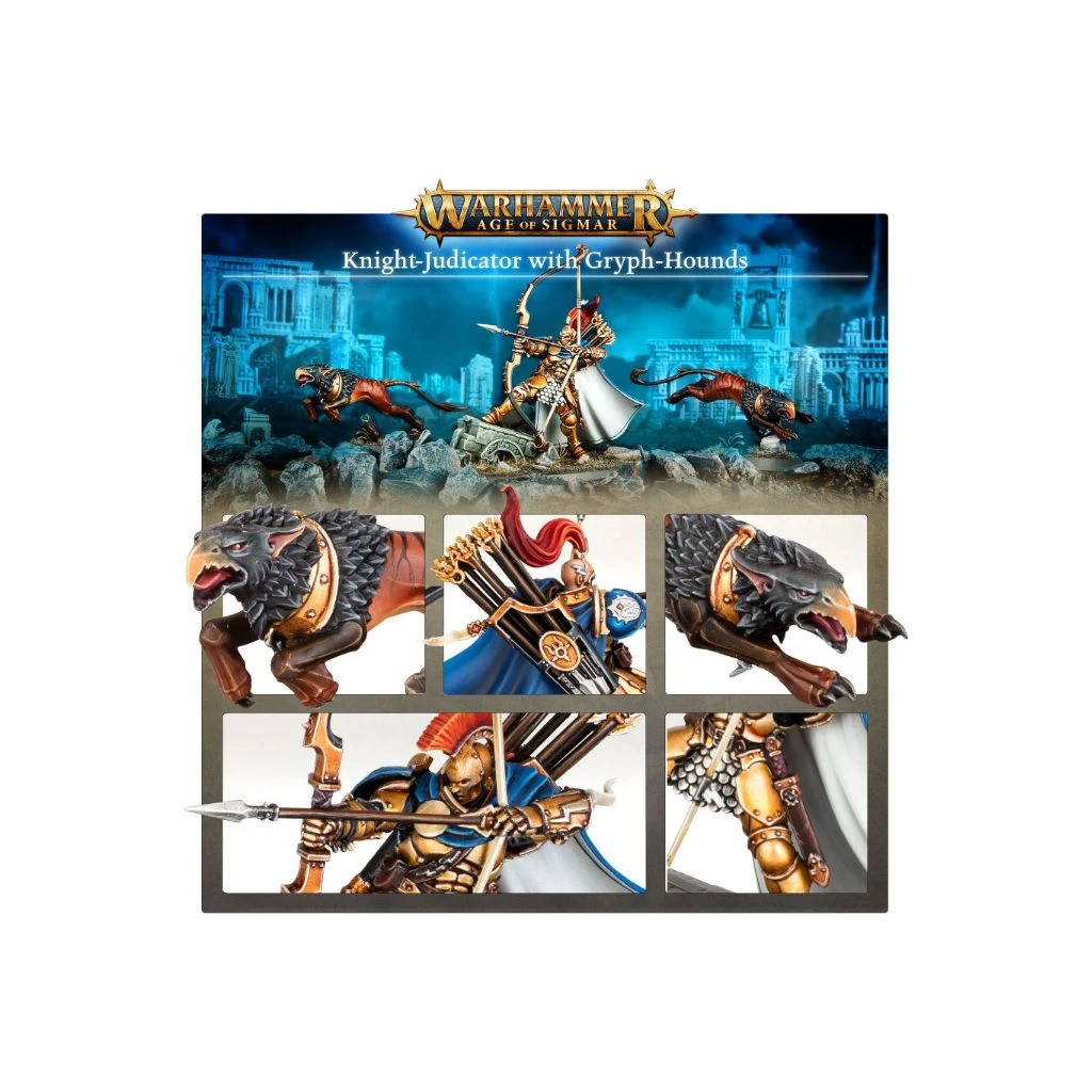 Le Chevalier-Judicator est un officier à l’œil d’aigle des Conclaves Angelos qui manie le terrifiant grand arc terminus, une arme gigantesque pouvant abattre les cibles les plus imposantes à l’autre bout du champ de bataille. Ses fidèles Gryph-dogues le protègent des dangers environnants et harcèlent les ennemis qui approchent trop.