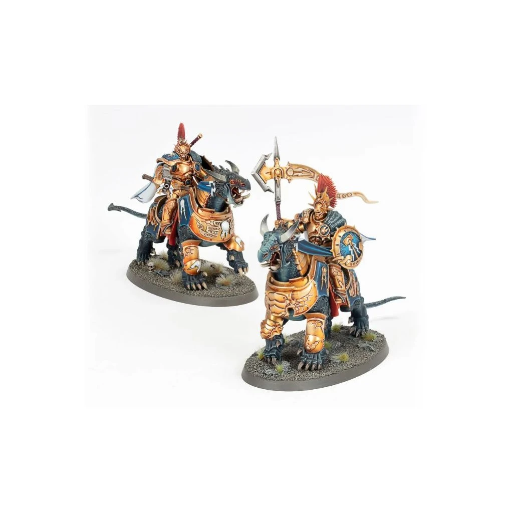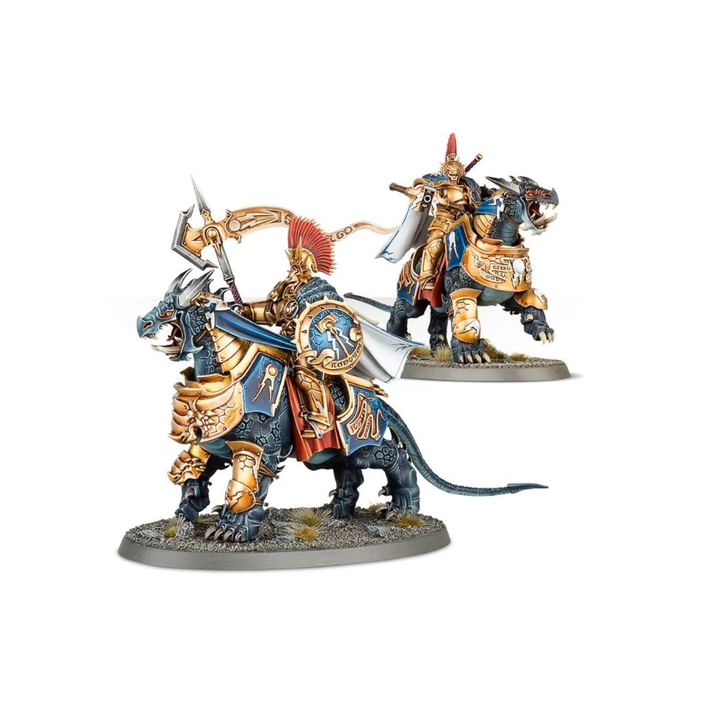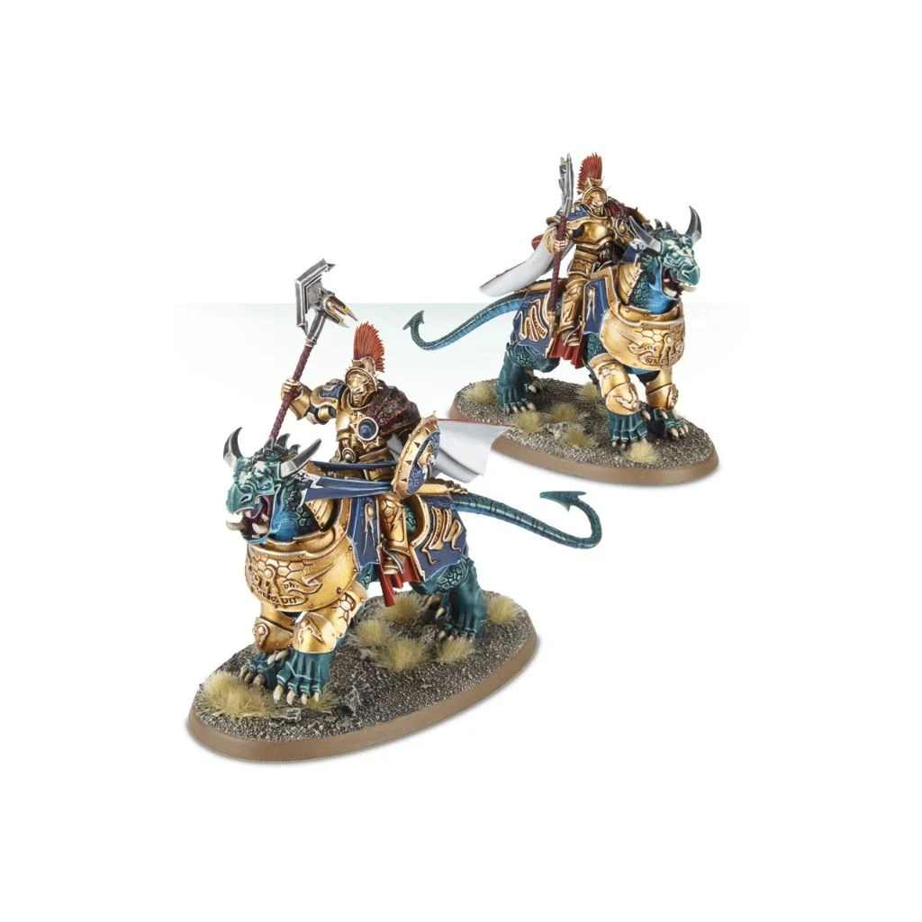 Ce kit plastique comprend tout le nécessaire pour assembler deux Dracothian Guard Fulminators armés de glaives Stormstrike et de boucliers de sigmarite, et montés à dos de féroce Dracoth.