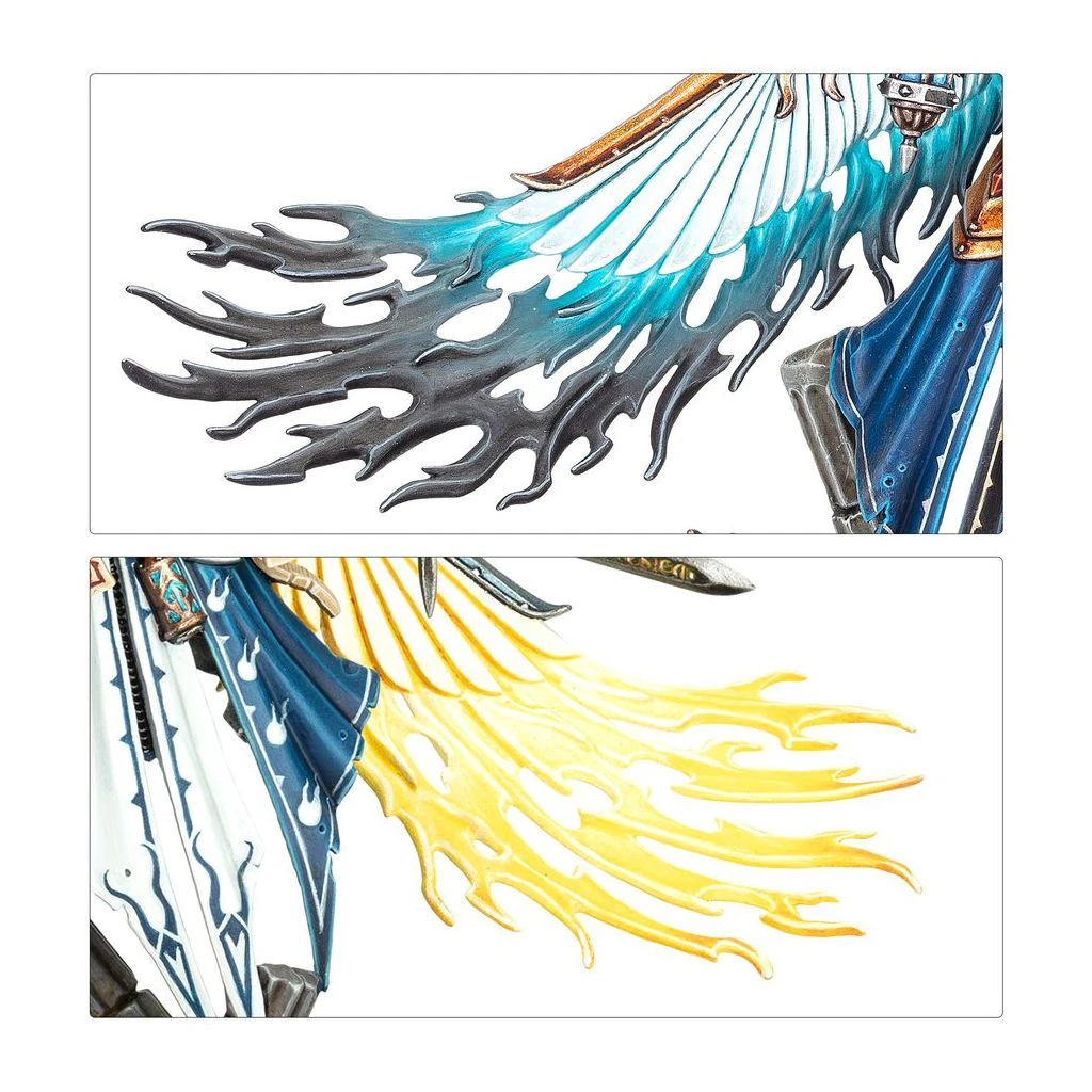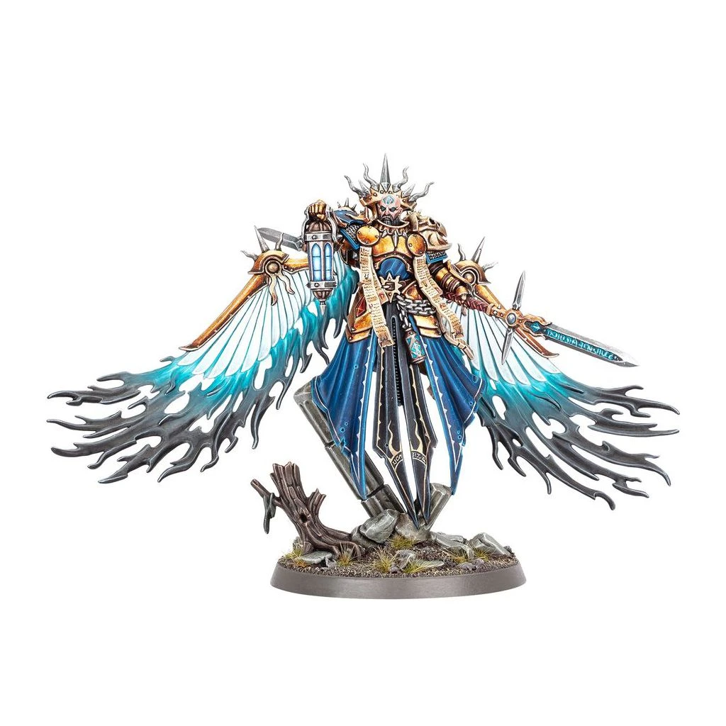 Ce kit en plastique à emboîter permet d’assembler Tornus l’Affranchi, un puissant héros pour les armées d’Éternels de l’Orage dans Warhammer Age of Sigmar. Son âme désormais rachetée, le guerrier jadis connu sous le nom de Torglug le Honni est désormais un héraut volant de Sigmar, assigné aux chambres de la Perdition. Il vole sur des ailes de lumière ressemblant à des plumes en lambeaux, et son armure ainsi que sa peau sont frappées de l’iconographie des chambres de la Perdition. Il est armé d’une redoutable grande lance sanctifiée. Ce kit permet autrement d’assembler un Chevalier-Azyros standard, équipé d’une arme astrobénite.