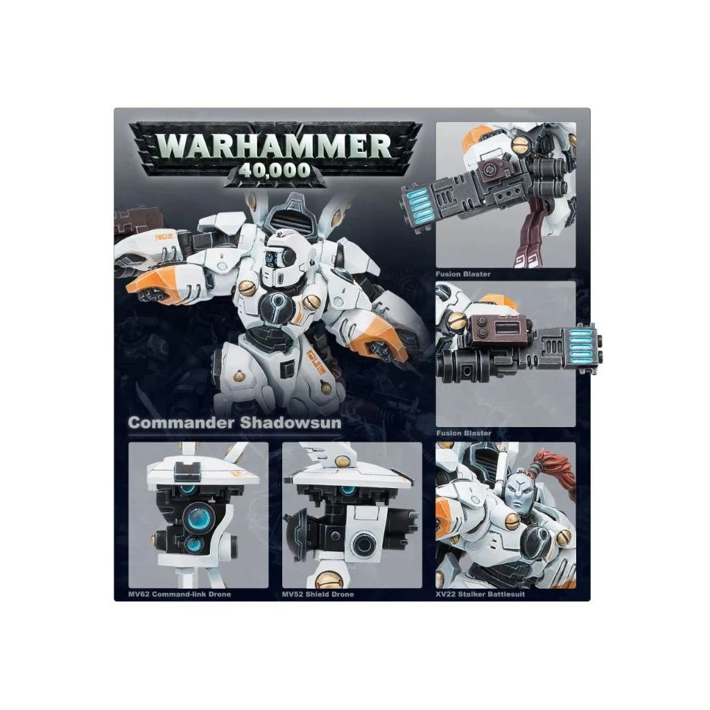 O’Shaserra, dite Commander Shadowsun, est une guerrière d’exception doublée d’une tacticienne magistrale. Elle bondit à travers le champ de bataille dans son exo-armure XV22, recourant à ses systèmes de visée avancés et à sa technologie de furtivité sophistiquée pour identifier et traquer sa proie sans être vue. Avec son éventail d’armes elle est le fléau de quasiment tous les ennemis – ses éclateurs à fusion se rient des blindages les plus lourds, ses nacelles de missiles éventrent les véhicules légers et son lance-fléchettes déchiquette quiconque s’approche trop, dans une gerbe de projectiles acérés.