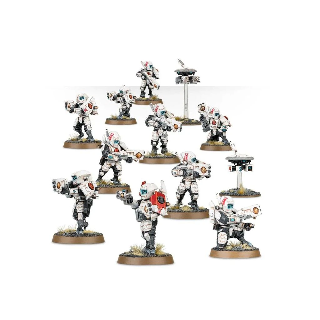Ce kit plastique contient tout le nécessaire pour monter dix Fire Warriors du T’au Empire, en configuration de Strike Team. Une figurine peut être promue Shas’ui, et le kit inclut deux drones, une tourelle d’appui tactique DS8, un assortiment d’épaulières et de paquetages variés, plus tout un choix d’armes: fusils ou carabines à impulsion, et grenades à photons et PEM! 230 pièces en tout, avec dix socles ronds Citadel de 25mm, un socle rond Citadel de 40mm et deux petits socles volants.