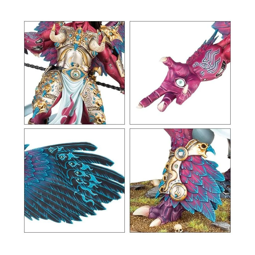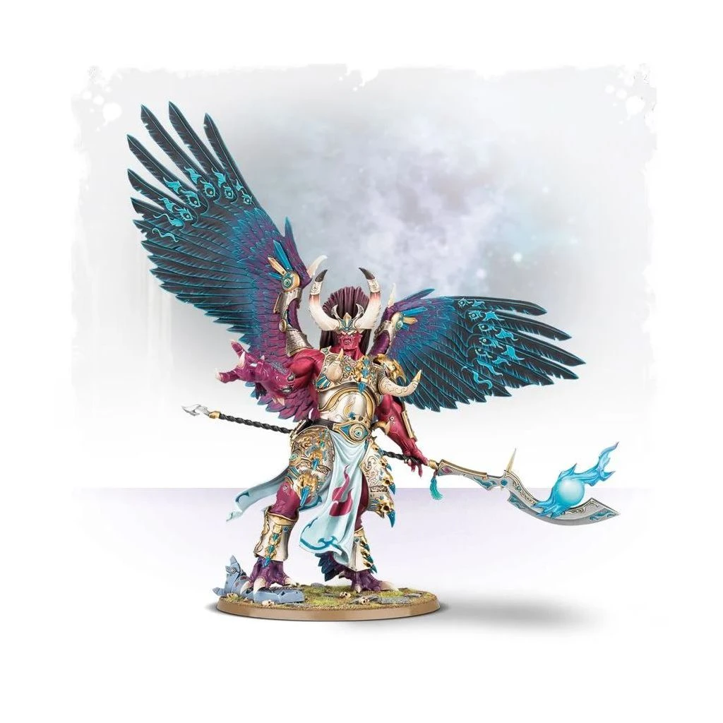 L’air lui-même hurle quand Magnus the Red plonge du ciel, et la pierre fond sous son ombre. Fils cyclopéen de l’Empereur de l’Humanité, il défie la logique par sa simple présence. Le regarder, c’est renoncer à la raison, et quand le Roi Écarlate regarde à son tour, il répand une destruction inimaginable. Seul l’Empereur le surpasse en capacité psychique, et il fend la réalité d’un coup de sa lame, en anéantissant même les engins super-lourds par la seule intensité de son ire. Puis Magnus the Red prend son essor d’un battement de ses puissantes ailes, et il jouit de sa puissance surnaturelle tandis qu’il sème la désolation chez les faibles êtres qui osent s’opposer à lui.