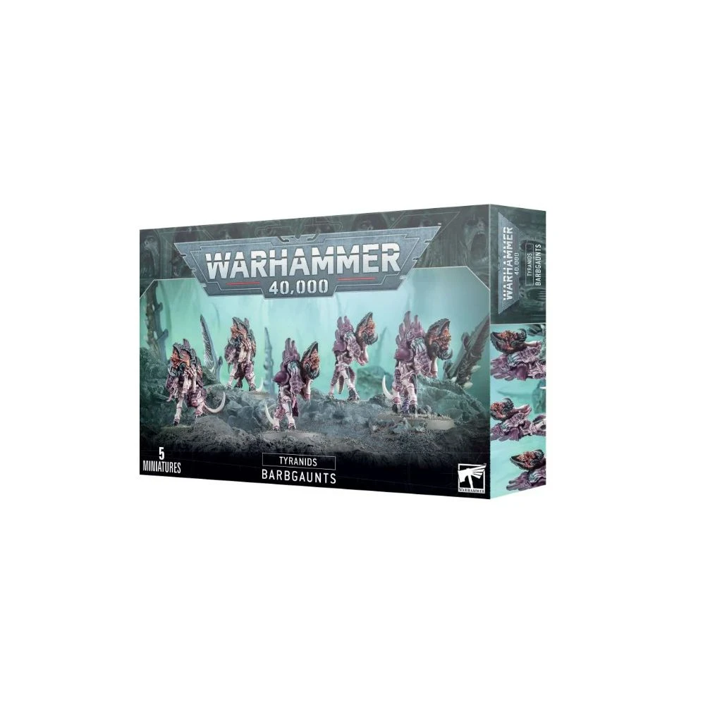 Ce kit plastique permet d’assembler cinq Barbgaunts, des créatures tyranides conçues pour servir d’artillerie biologique. Chacun de ces gros gaunts voûtés est fusionné à un lance-barbillons grotesque. Cinq de leurs membres servent à soutenir cette arme vivante ou à fournir une plate-forme de tir stable, tandis que le sixième est réduit à l’état de griffe atrophiée. Ces bêtes de somme sont contrôlées par des parasites cérébraux, dont les tentacules charnus plongent dans le crâne dépourvu d’yeux du Barbgaunt pour diriger ses tirs organiques.